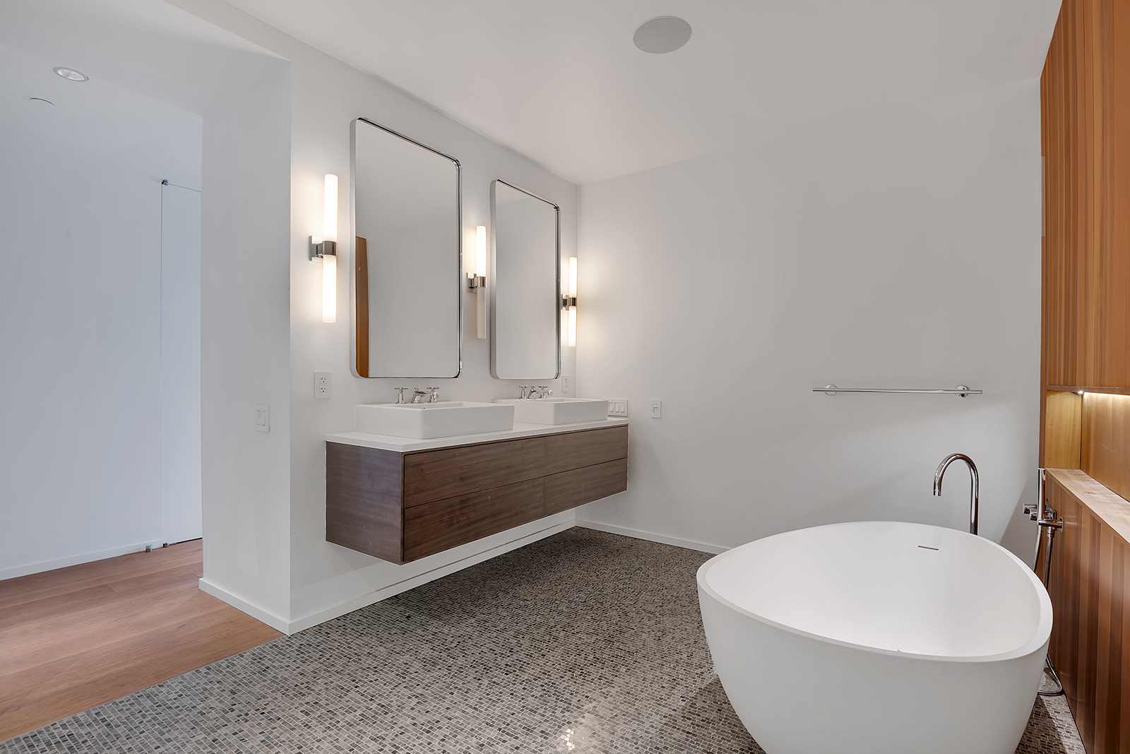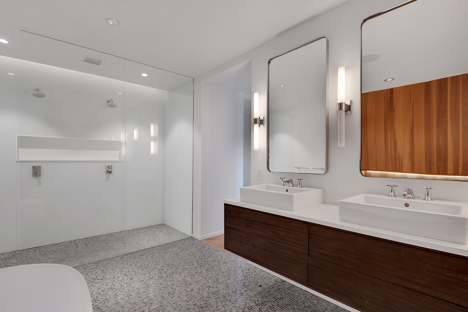 Each bedroom features an en-suite bath, custom closets, and sweeping western-facing views. The master suite is outfitted with a double shower, deep-soaking tub, vanity, and is decorated with stone mosaic floors.
