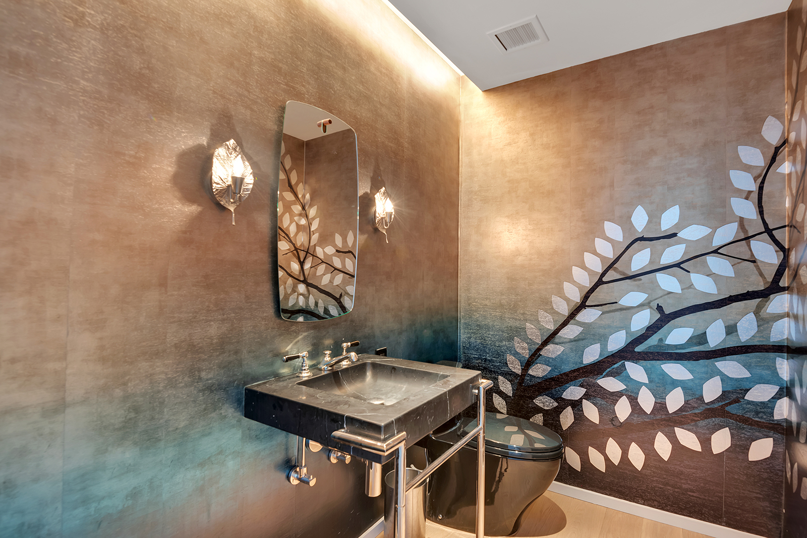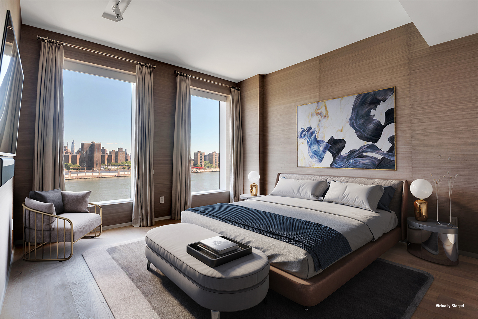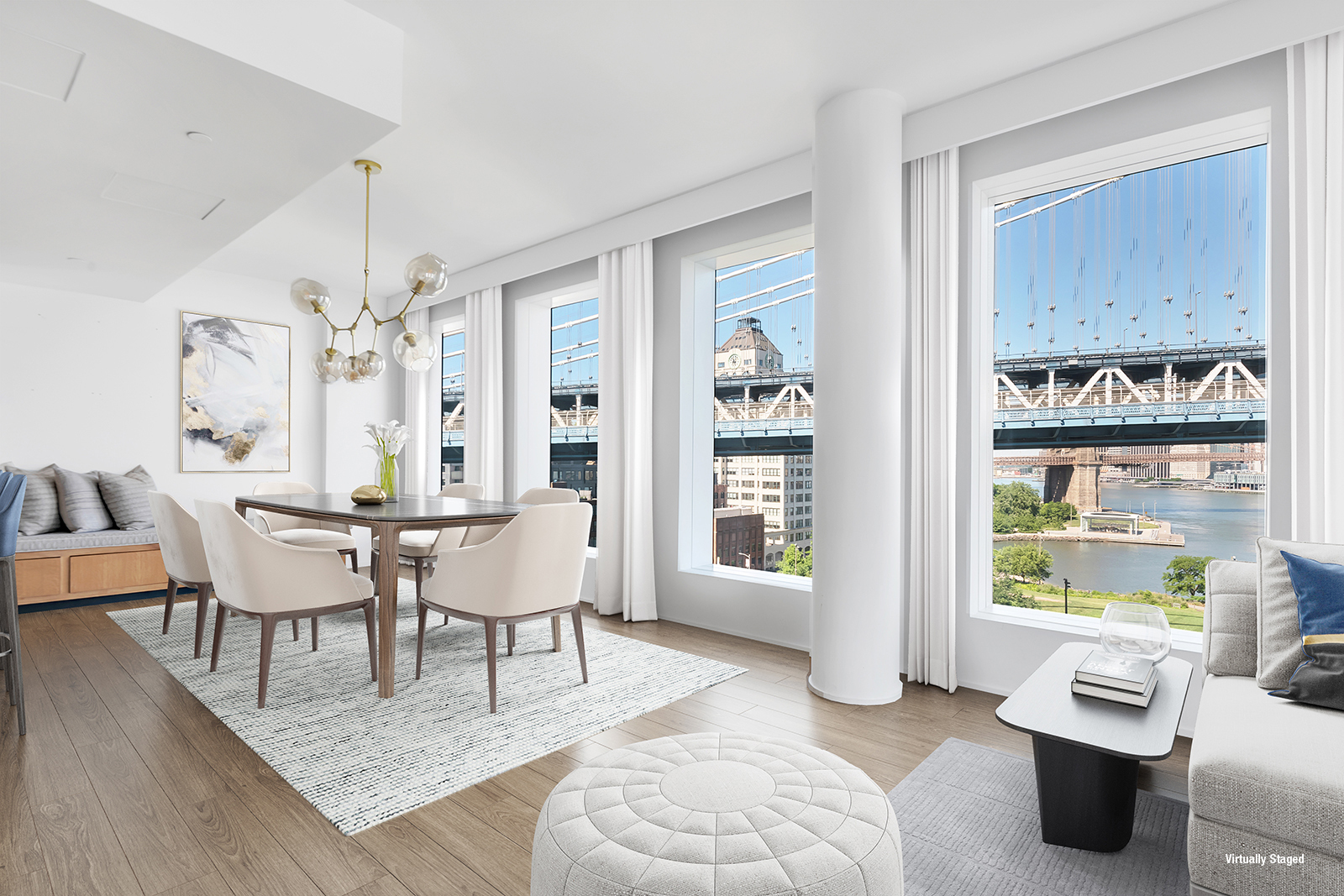 As you enter the 2,486-square-foot space, one is immediately greeted by the breathtaking views, while the grand entry foyer and powder room give way to the expansive living and dining areas. The kitchen is fully equipped with Italian cabinetry by RiFRA, Gaggenau appliances, a Bosch dishwasher, a vented hood, and a wine fridge.