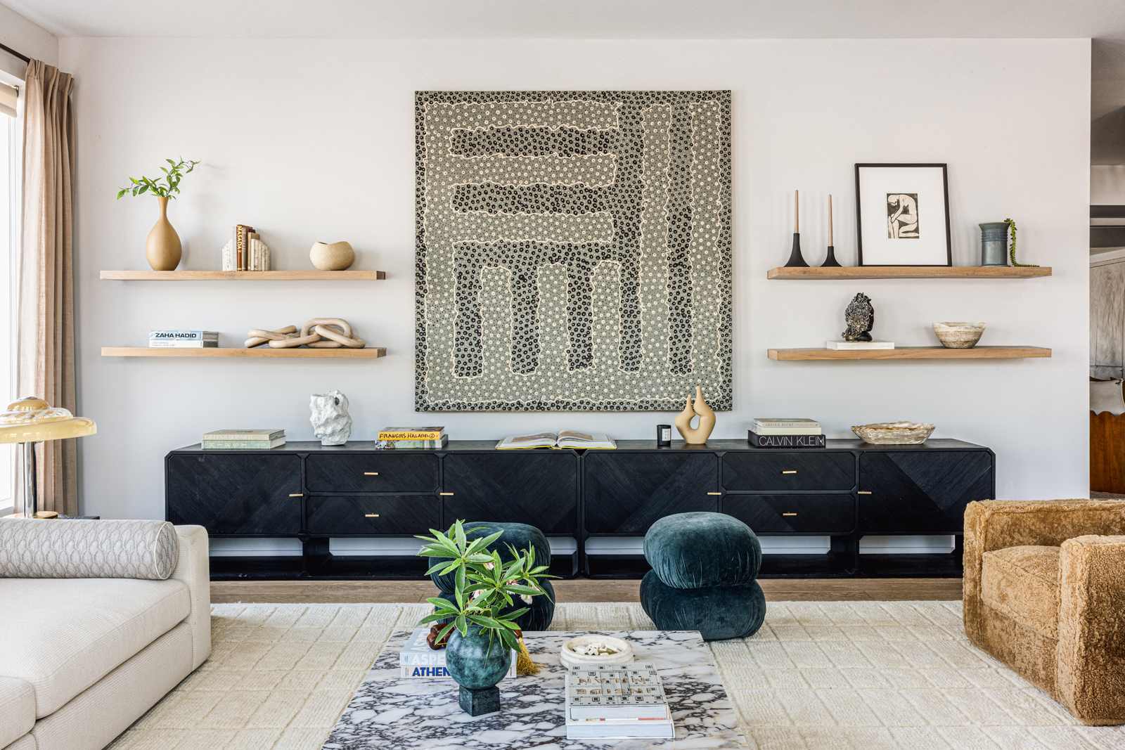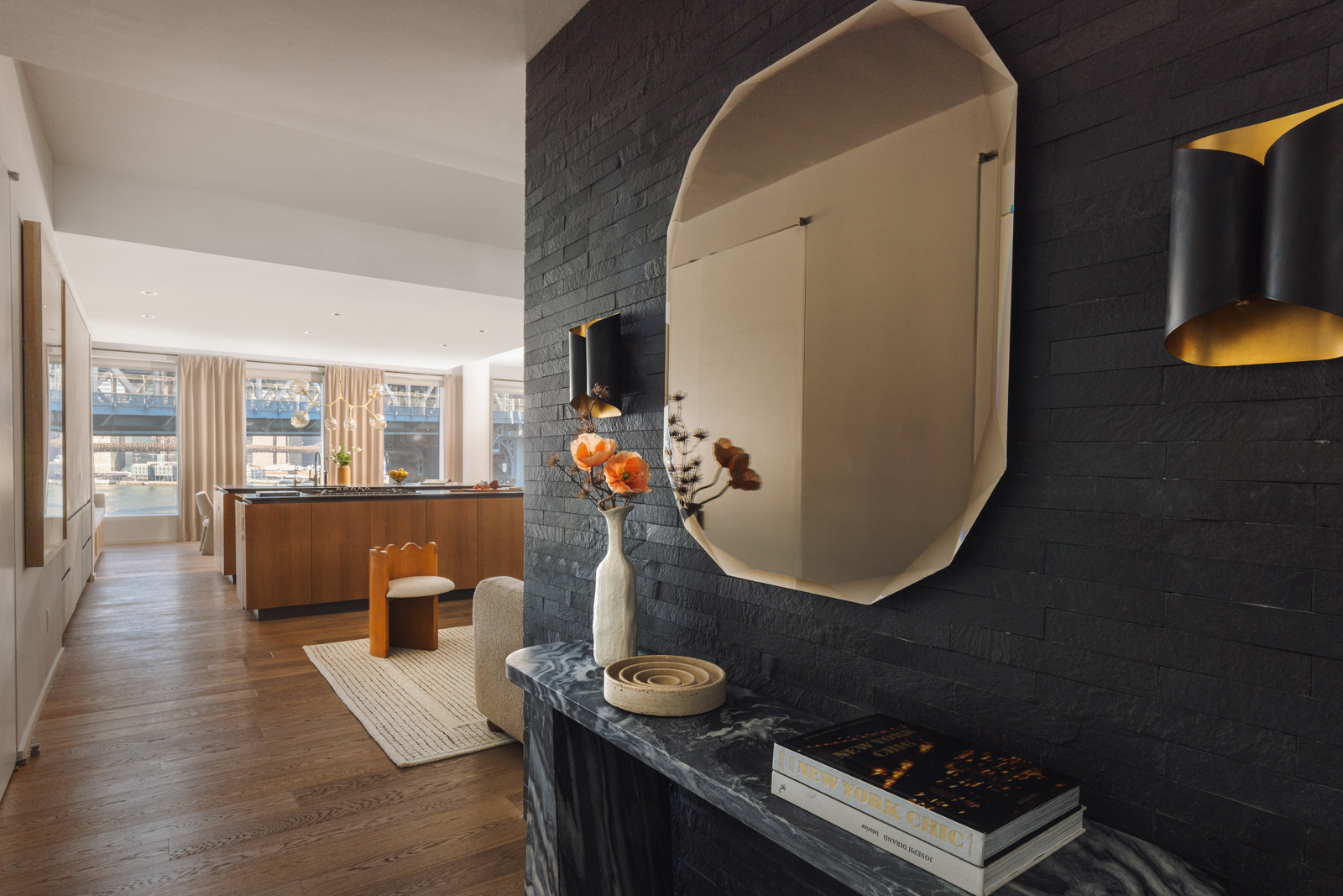 As you enter the 2,486-square-foot space, one is immediately greeted by the breathtaking views, while the grand entry foyer and powder room give way to the expansive living and dining areas. The kitchen is fully equipped with Italian cabinetry by RiFRA, Gaggenau appliances, a Bosch dishwasher, a vented hood, and a wine fridge.