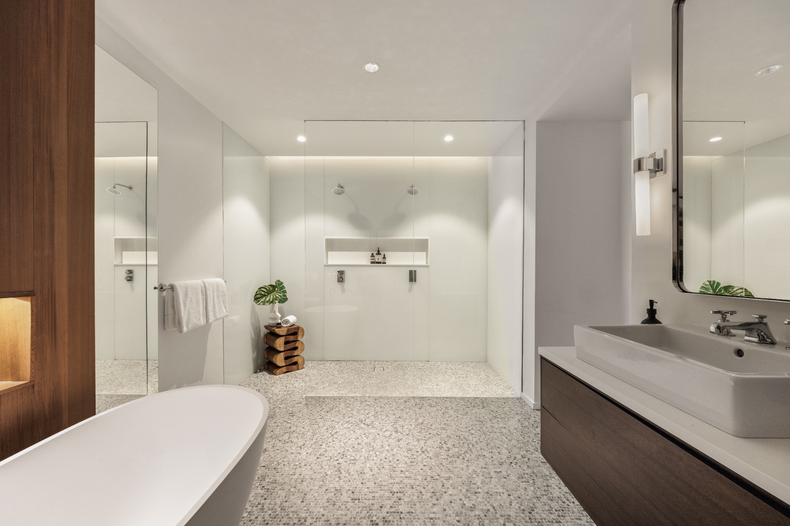 Each bedroom features an en-suite bath, custom closets, and sweeping western-facing views. The master suite is outfitted with a double shower, deep-soaking tub, vanity, and is decorated with stone mosaic floors.