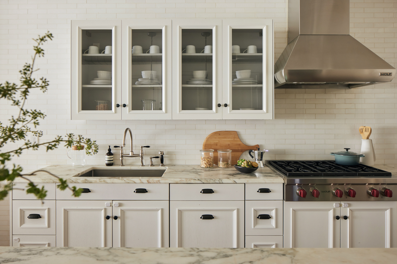 The custom chef’s kitchen is adorned with carefully selected materials such as a Calacatta Gold marble countertop and Thassos marble backsplash paired with custom WaterWorks fixtures. Designed with the most discerning chefs in mind, a top-of-the-line appliance package includes a six-burner Wolf range-top with a fully vented hood, a Wolf double-wall oven, a 36-inch Sub-Zero refrigerator, a 24-inch dual-zone Sub-Zero wine fridge, a Wolf built-in microwave, and a Miele self-open dishwasher.