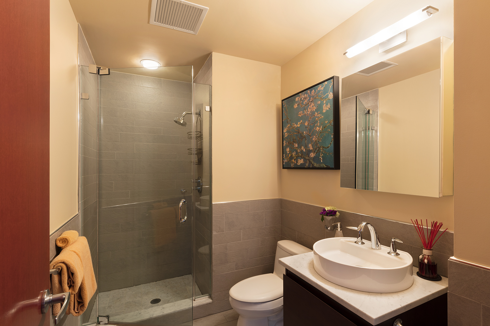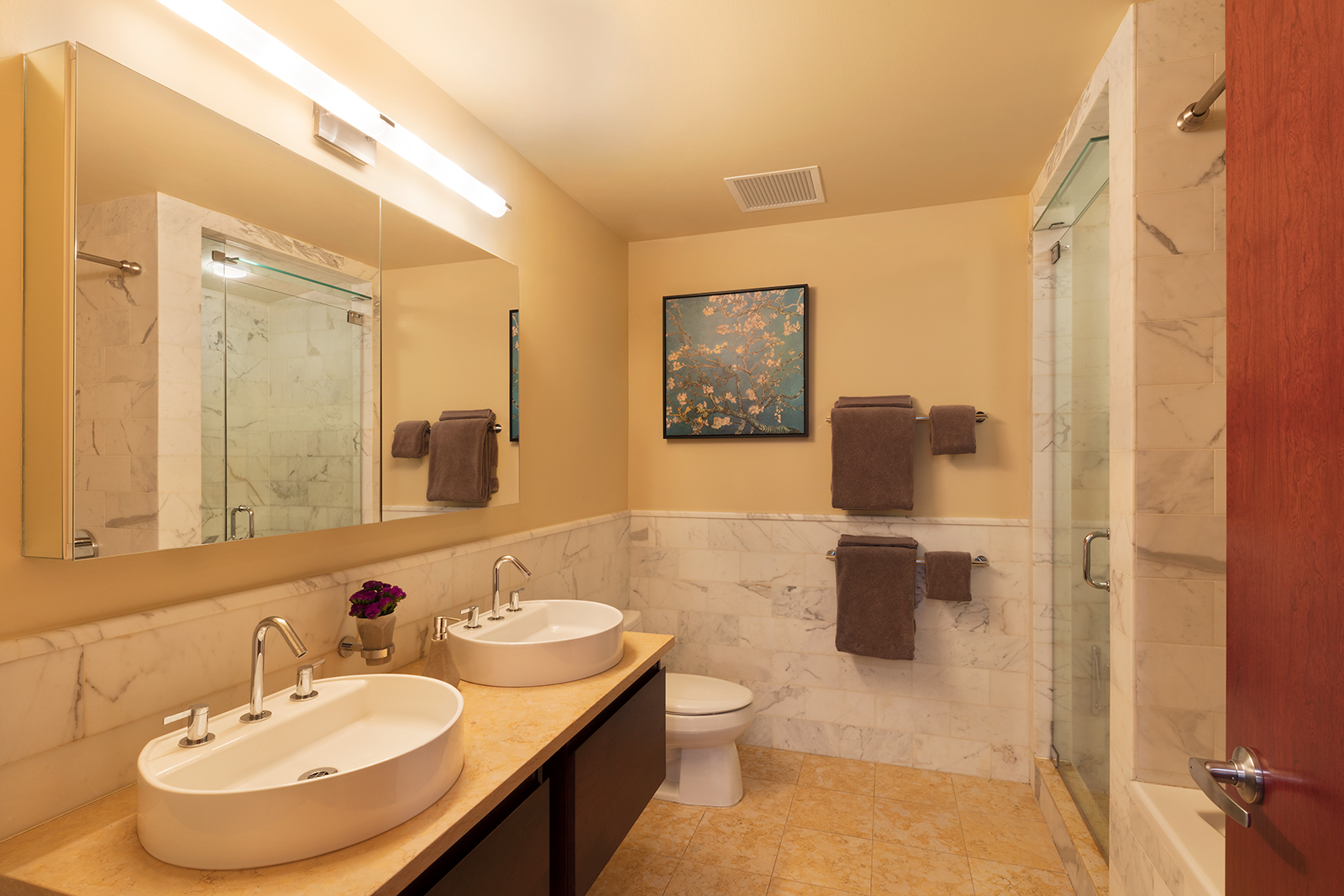 Beyond the living area into the bedroom is a nearly 200-square-foot master suite with two large custom fitted closets and a five-fixture master bath with double sinks, a separate steam shower, radiant heated floors and a combination of limestone and marble materials.