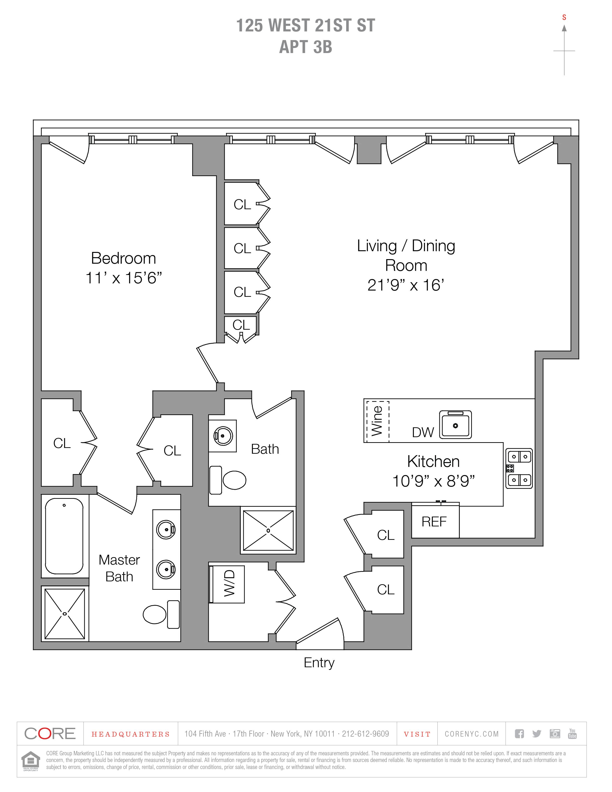 Totaling 992 square feet of highly useable space, 3B feels like a loft but offers the luxury and functionality of new construction. Enter the home through an intimate foyer with two coat closets and the unit’s stacked washer and vented dryer. Beyond the entryway is a massive and open U-shaped kitchen with Poggenpohl cabinetry, a professional grade Viking appliance package and a 24-bottle wine refrigerator. The breakfast bar seats up to six and opens up to a 22-foot wide living and dining room with stunning floor-to-ceiling glass casement windows, approximately 9.5-foot ceilings, tons of custom storage and built-ins and the option to carve out a small second bedroom, guest room or nursery. There is also a beautifully appointed full bathroom with a walk-in shower off of the living room.