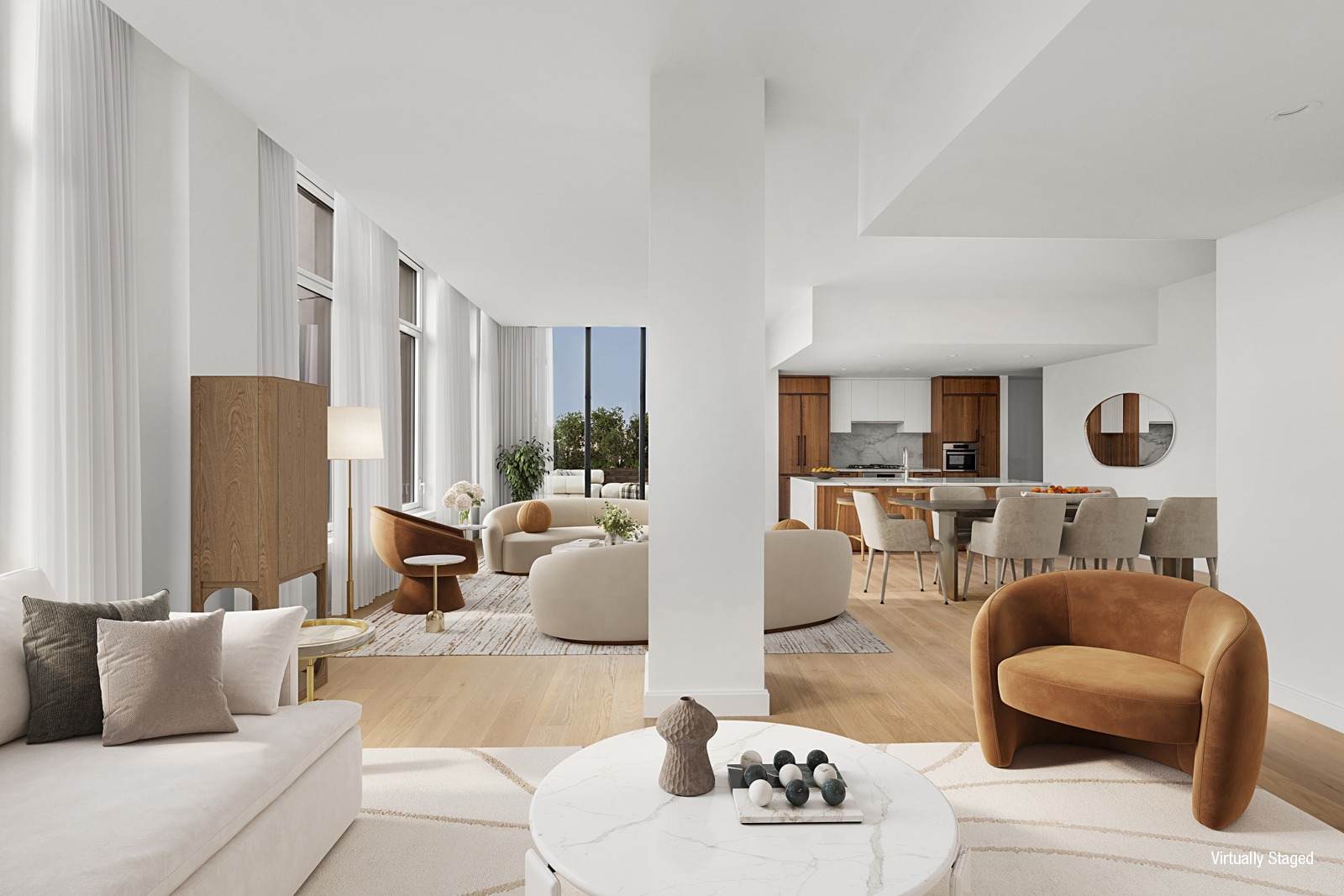 The apartment, currently configured as a two-bedroom, has the potential to be reconverted back to its original layout to accommodate a third bedroom. Additional features include 7” wide custom-stained European White Oak flooring, quarter-cut walnut-clad entry doors, and high-efficiency central heating and cooling. Two storage units transfer with the sale.