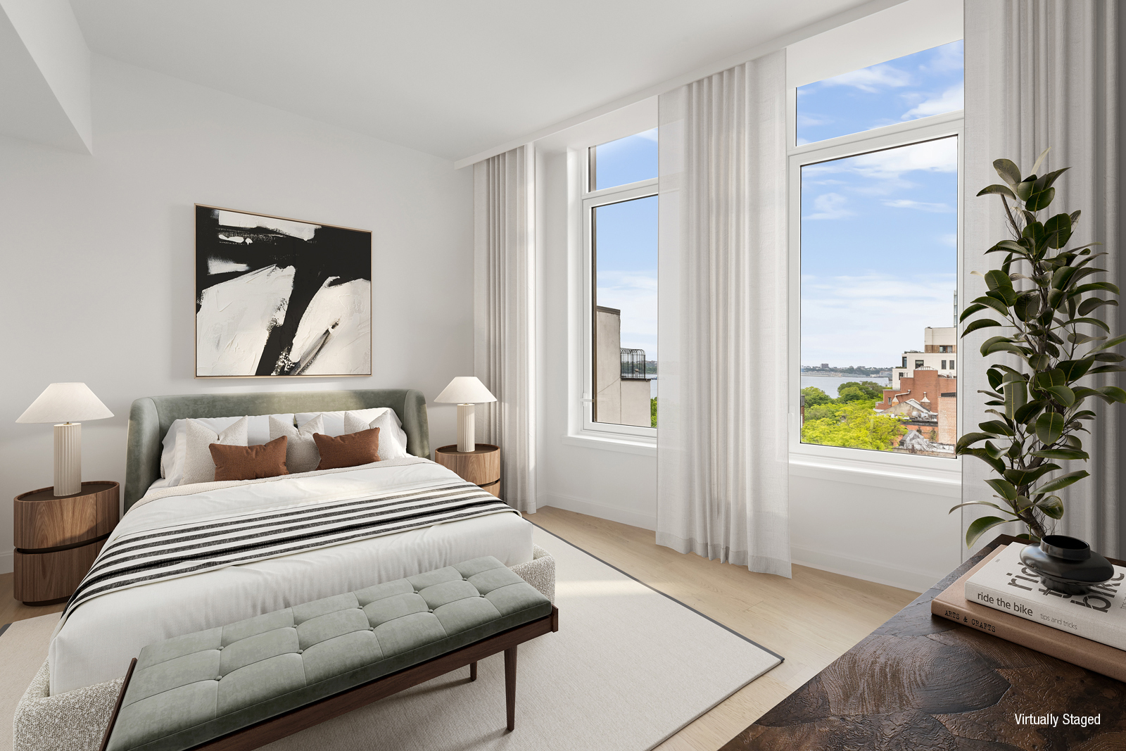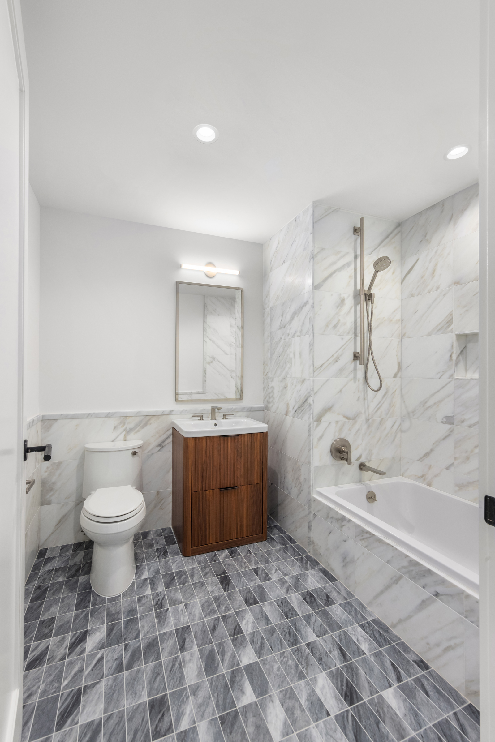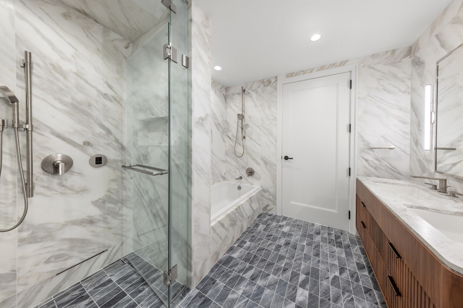 Each bedroom is bright and airy with generous closet space. The bathrooms feature a 60” tub shower, custom walnut vanity, honed Barri Grey tiled marble floor, honed Empress White marble tile wall, brushed nickel fixtures, and radiant heat flooring in the primary.