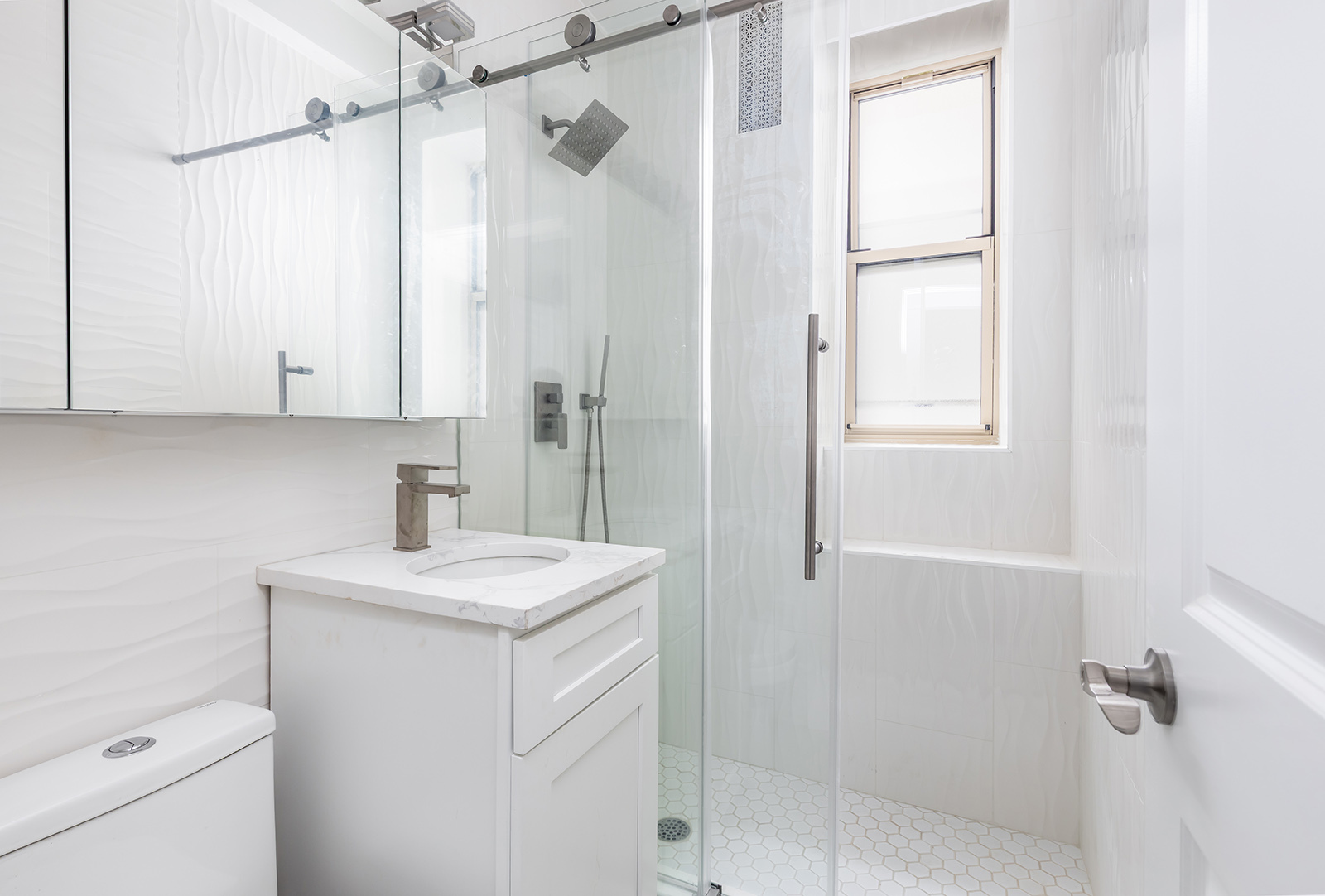 The king-size bedroom has a quiet courtyard view through its two oversized windows and has ample space for a home office. There is also built-in storage, a walk-in closet, and a windowed three-fixture, en-suite bathroom with all new handblown floor-to-ceiling tiling, a large storage vanity, and a glass shower enclosure.