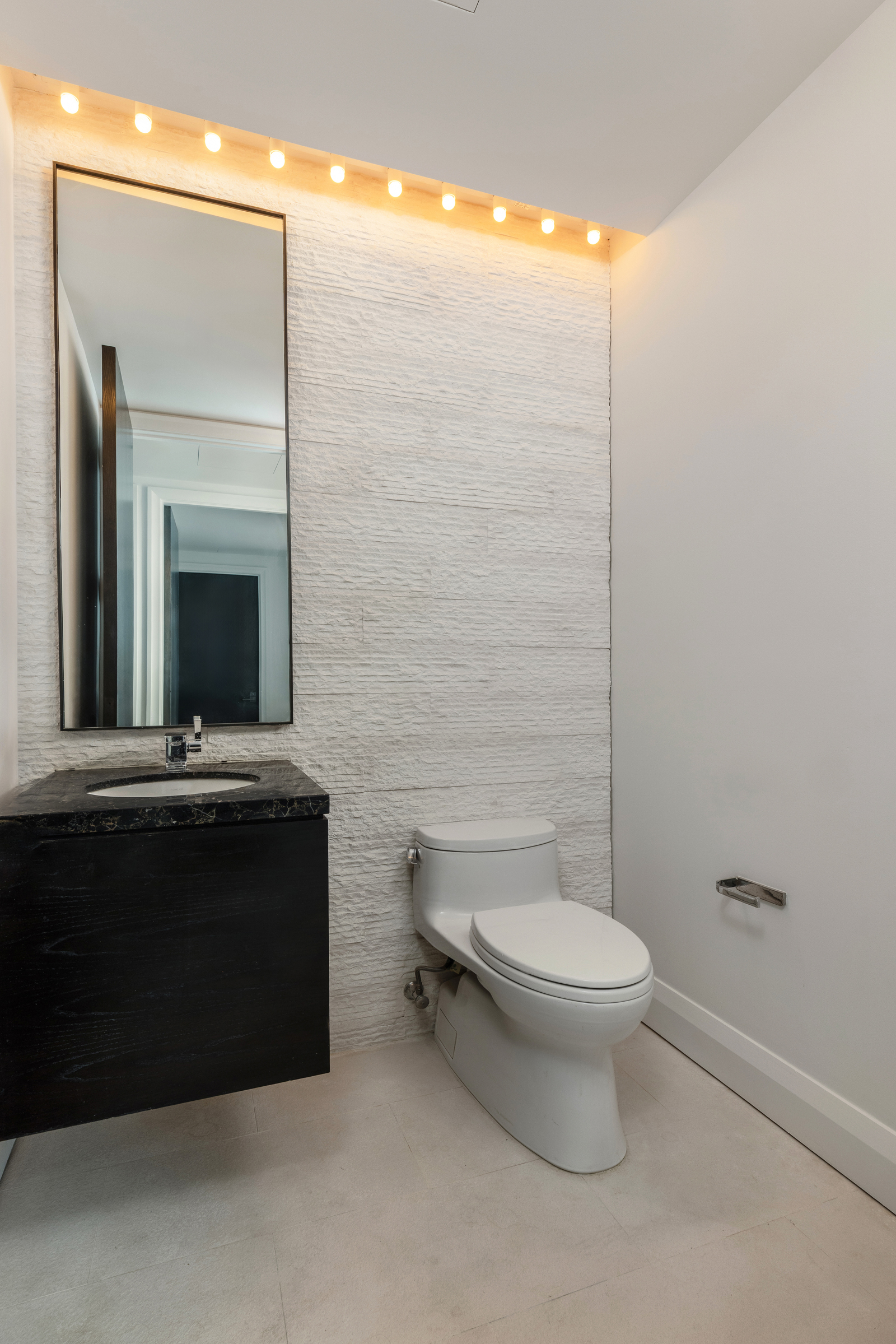 The chef’s kitchen is a true sanctuary for culinary enthusiasts, appointed with top-of-the-line appliances, high-gloss custom cabinetry, a Marvel wine cooler, and a custom Miele panelized refrigerator and dishwasher. A dramatic Basaltina stone slab countertop anchors the room, serving as both a sculptural centerpiece and a highly functional workspace. A Bosch washer/dryer adds everyday convenience.