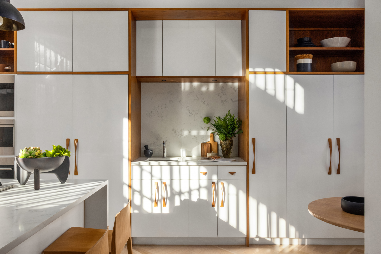 The adjacent kitchen is sun-filled and impeccably appointed, with white and walnut cabinetry, Nublado countertops and backsplash, and a Blanco fireclay apron-front sink. Premium appliances by Miele, Wolf, and Liebherr include a five-burner gas cooktop, wall oven, microwave, warming drawer, and integrated coffeemaker, making the kitchen as functional as it is elegant.