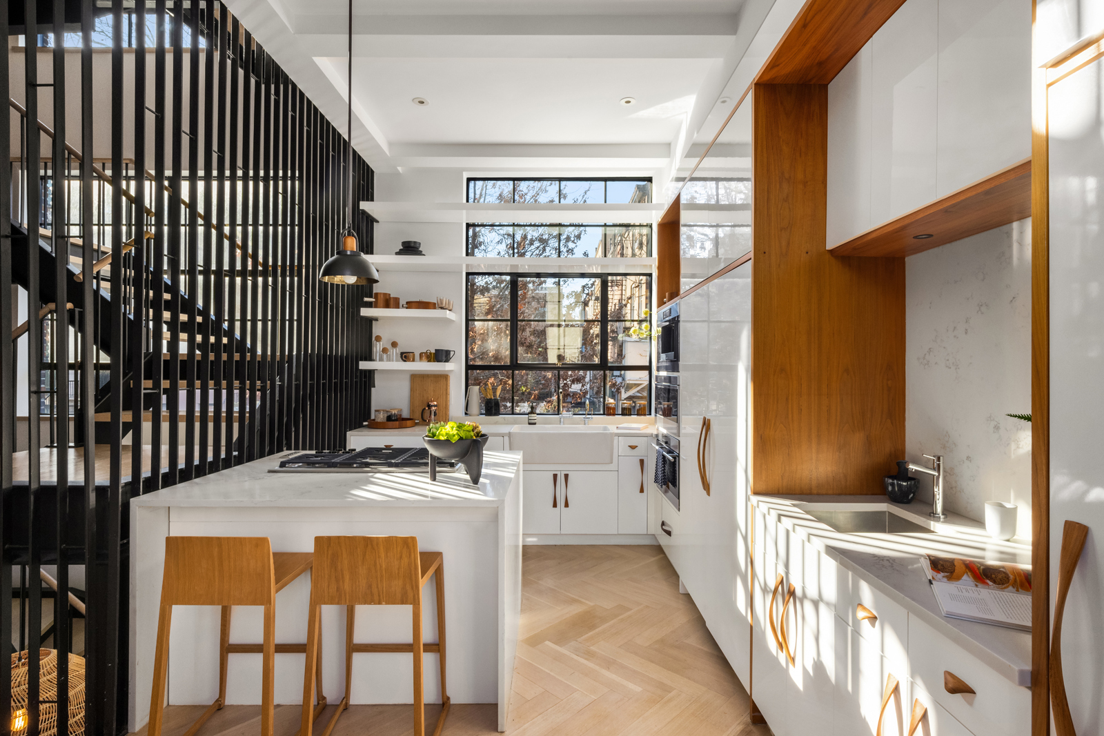 Throughout the home, materials such as rift-sawn limed oak wide-plank flooring laid in a herringbone pattern underscore the residence’s elevated design. A striking steel staircase runs alongside custom walnut shelving designed to function as a green or accent wall, adding a strong architectural element without overpowering the space.