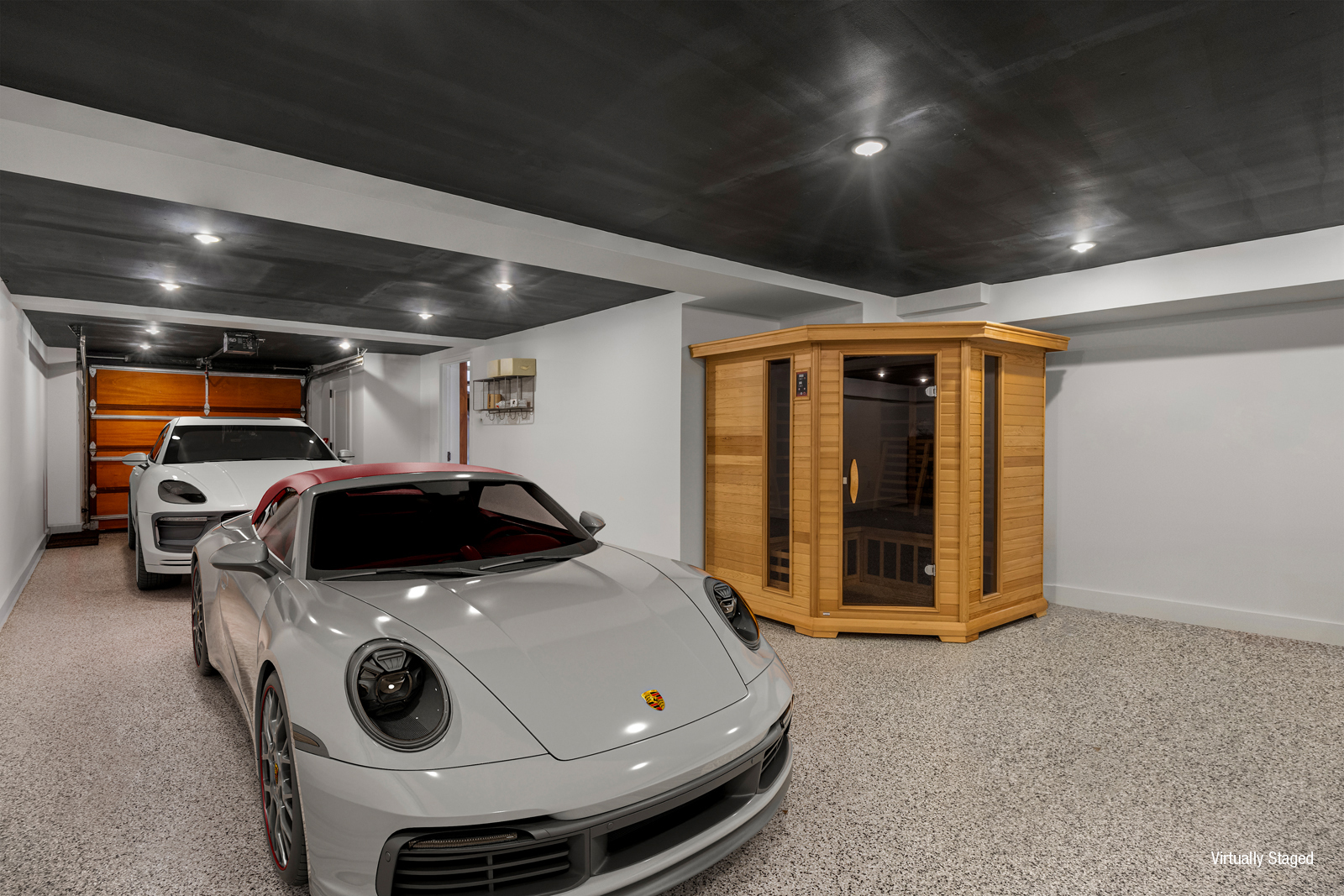 Oversized windows and a central skylight bring consistent natural light throughout the home. A private elevator serves all floors, and a rare curb cut leads to a multi-car garage with a Tesla charging station, accessed through a motorized, solid mahogany door. The garage comfortably accommodates two large vehicles and offers flexibility for a gym, studio, or work area.