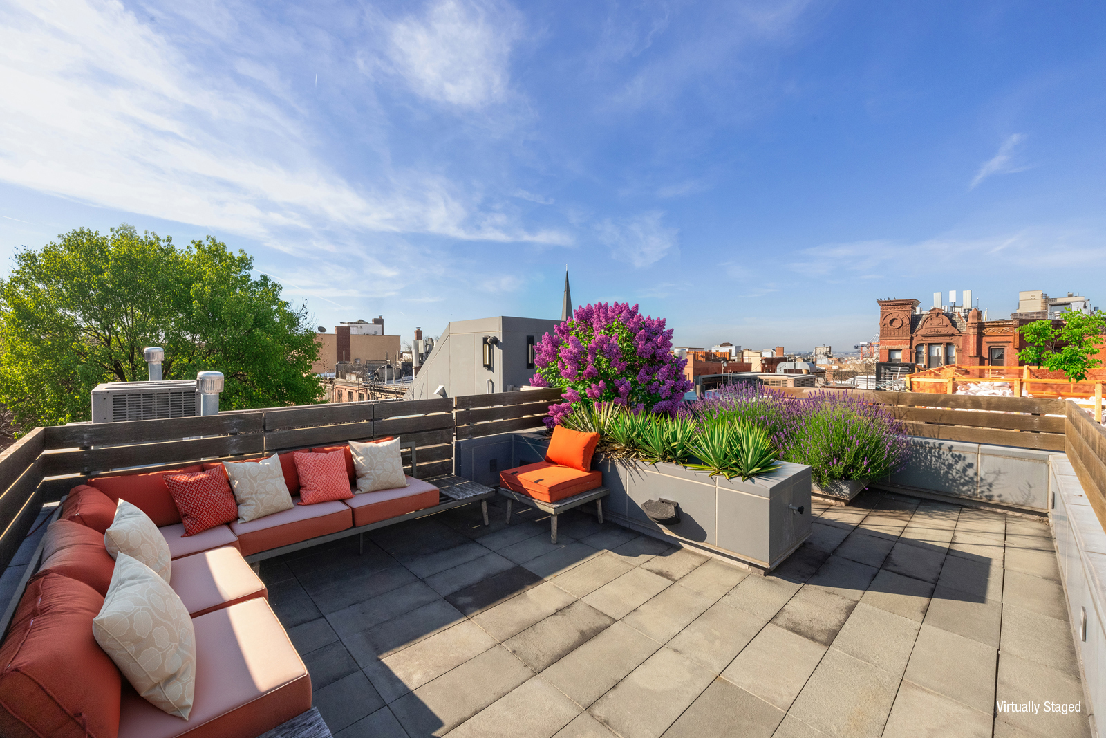 The finished basement includes a media room and wine cellar, providing ideal space for entertaining or private relaxation. Above, a roof deck offers sweeping views of the neighborhood and Lower Manhattan, creating another inviting outdoor living area.