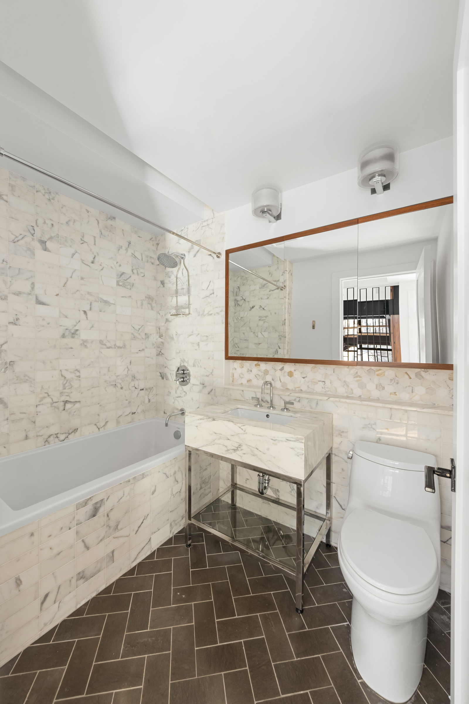 The third floor offers three generous, sunlit bedrooms, two bathrooms, and ample closet space. The top floor is dedicated entirely to the primary suite, providing separation and privacy. This level features a serene bedroom with views stretching to Lower Manhattan, a spacious walk-in closet, and a luxury bathroom with a freestanding oval tub, skylit shower, and custom marble vanity. Completing the floor is a home office and library with a wet bar, which can also serve as an additional bedroom, well-suited for quiet work or flexible living arrangements.