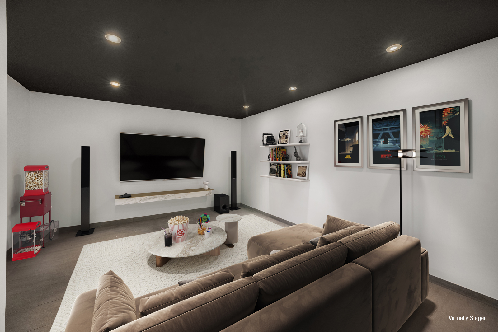 The main living level is defined by scale and openness. A 29-foot-wide living room with 12-foot ceilings opens through floor-to-ceiling glass doors to a landscaped terrace, seamlessly extending the living space outside. The terrace is outfitted with a kitchenette, grilling station, pergola, and built-in seating, well-suited for both everyday use and entertaining.