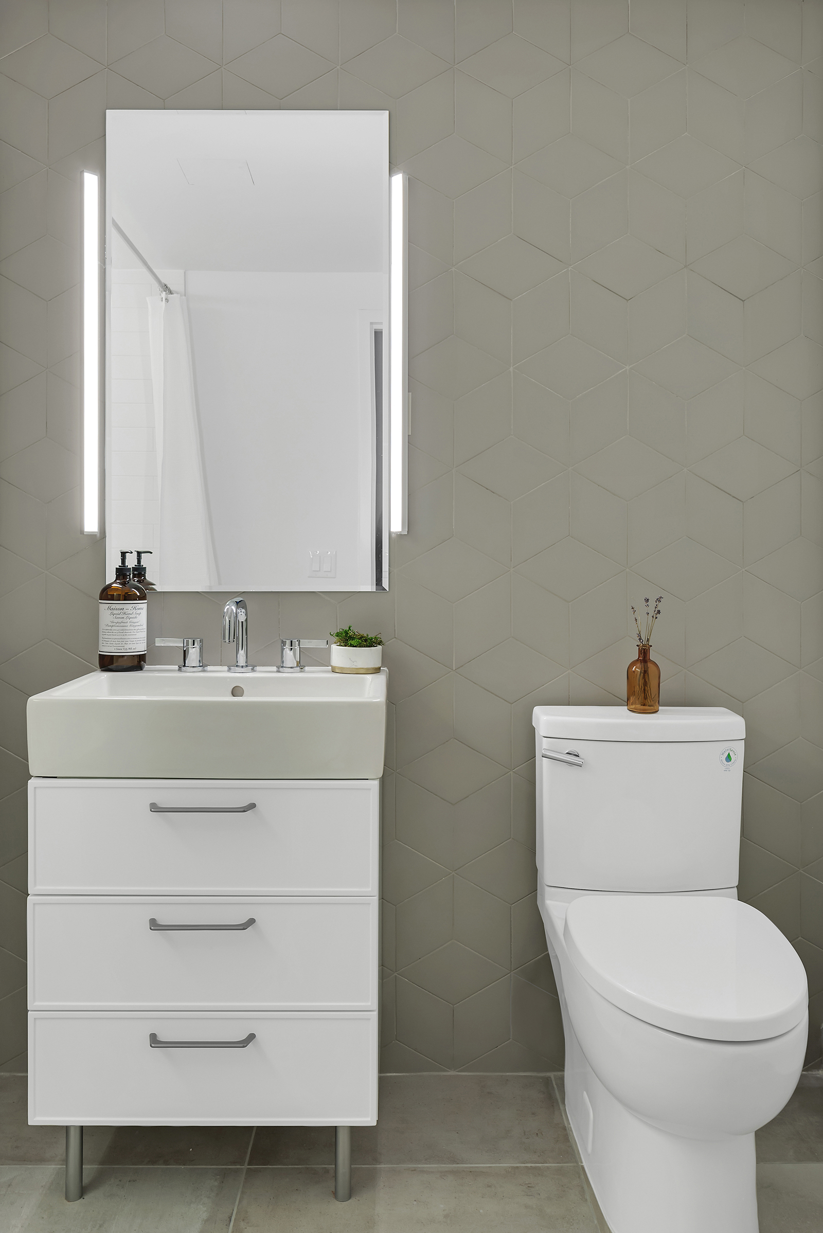 The bathroom features sleek polished chrome fixtures, ceramic washbasins with custom vanities, and porcelain tiling on walls and floors. Additional features include an in-home washer and dryer and an ample amount of storage space.