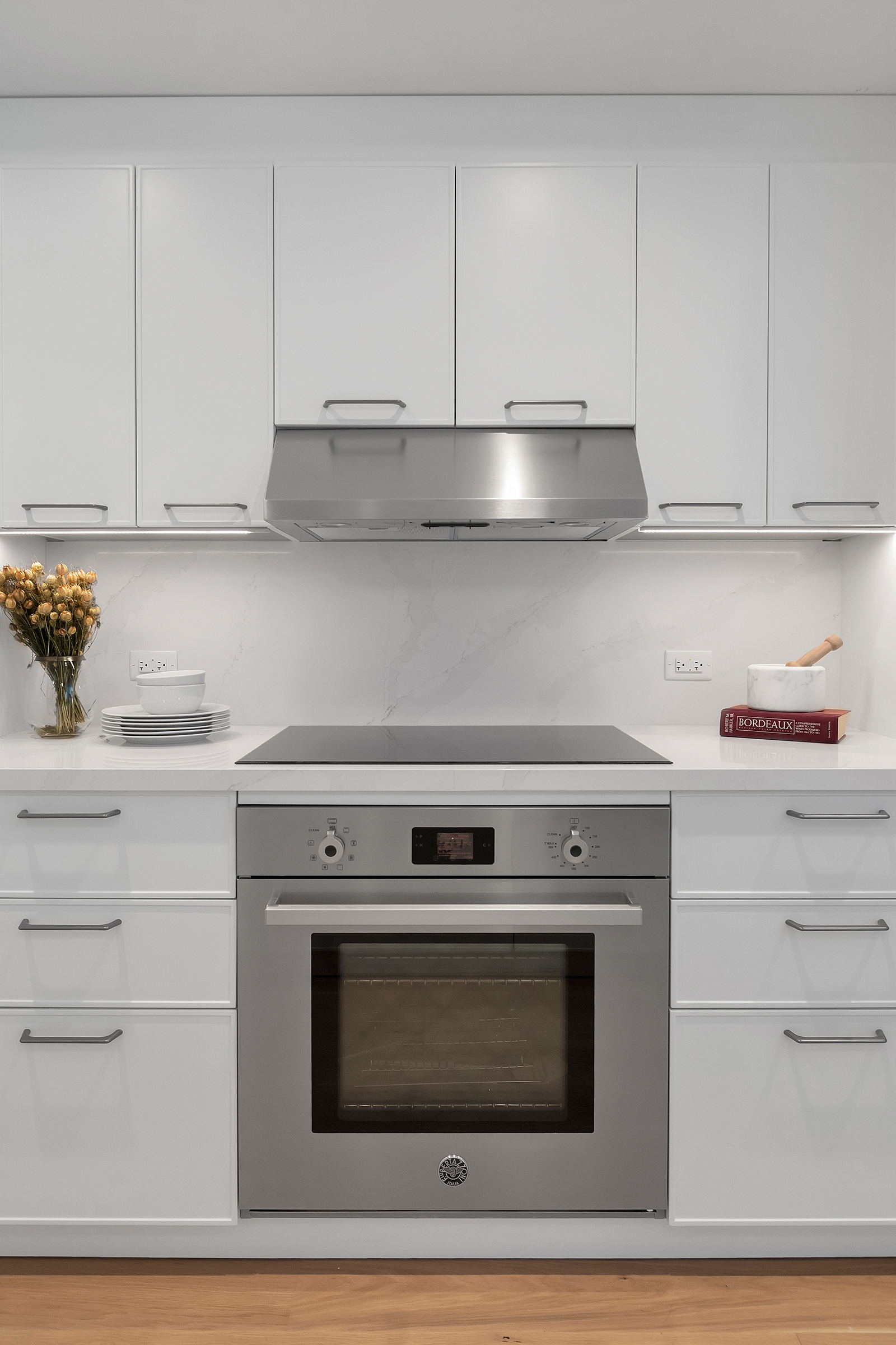 The contemporary kitchen is designed with custom white cabinetry, quartz countertops, and backsplash. Stainless steel appliances, including a Bertazzoni oven, Thermador induction cooktop, and Liebherr refrigerator round out the kitchen.