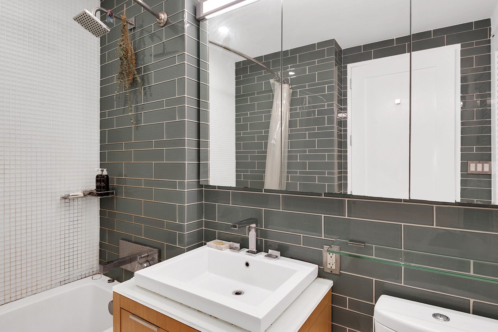 The spa-inspired bathroom is finished with elegant tile and a deep soaking tub. An in-unit washer and dryer completes this alcove apartment.