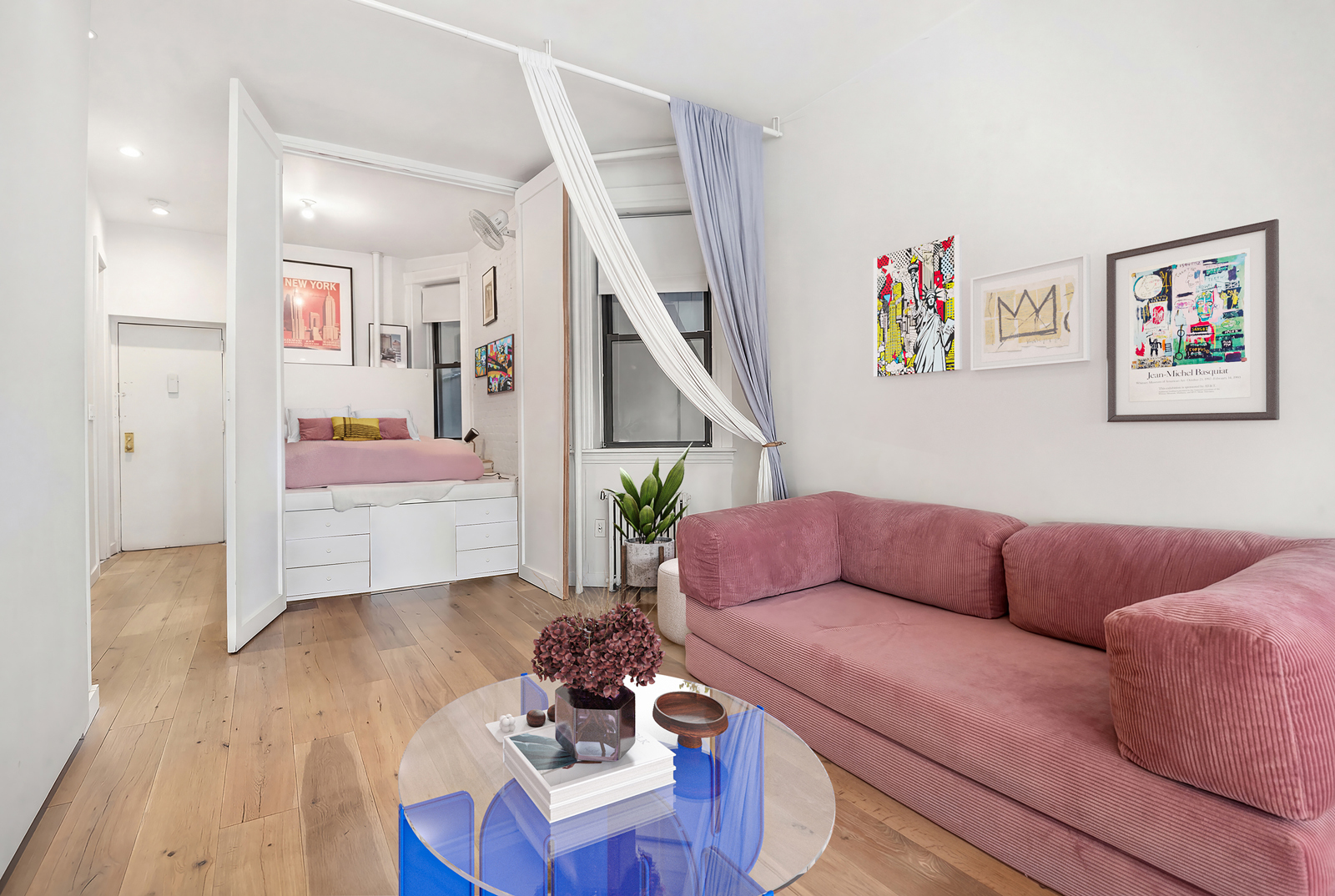 The expansive open living and dining area features gorgeous hardwood floors, an inviting setting for both everyday living and entertaining that’s seamlessly complemented by a stylish renovated kitchen outfitted with high-end appliances and an abundance of cabinet storage space. A thoughtfully designed sleeping area features a large custom closet that divides the space. And there’s a separate, flexible room that offers the ideal setup for a home office, guest sleeping area, or potential second bedroom. The home also features a renovated bathroom with marble tile.