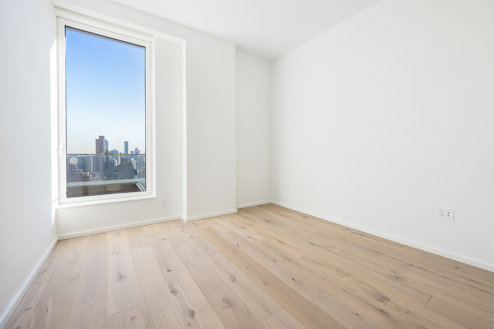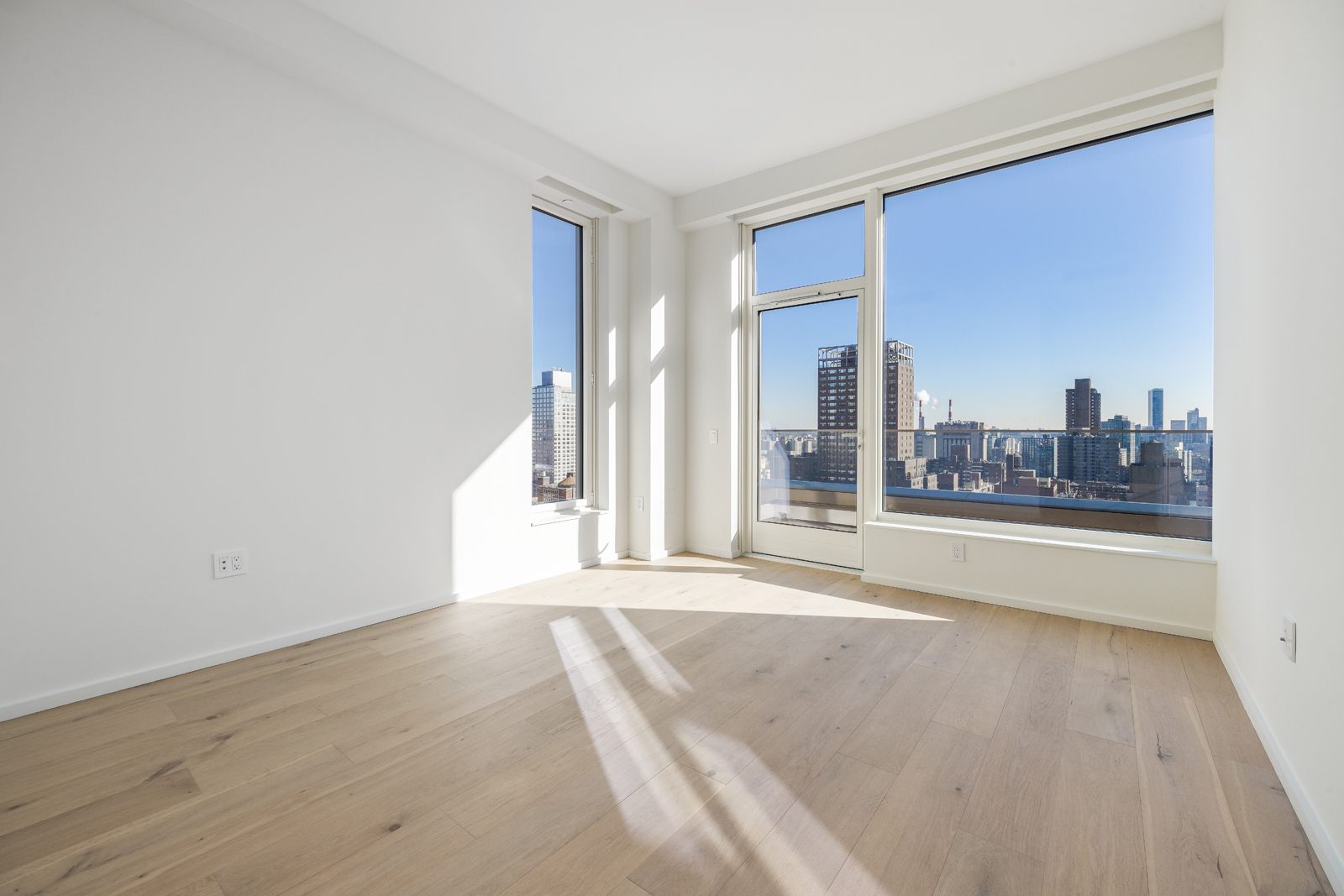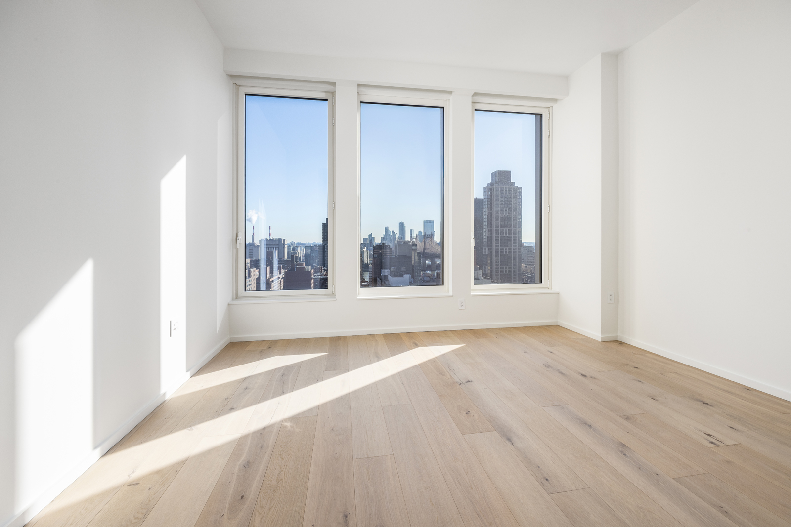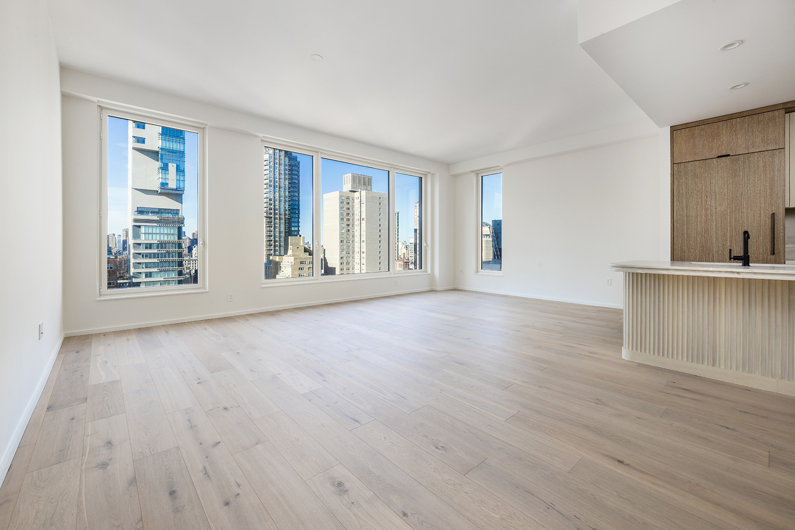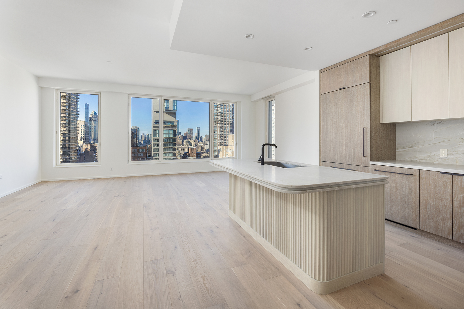 Residence 19A is a gracious three-bedroom, three-bathroom floor-through home with a private terrace and sweeping park, city, and East River views from three sun-filled exposures. Floor-to-ceiling windows frame dynamic vistas that stretch from the Treadwell Farm Historic District to Central Park, flooding the residence with natural light throughout the day. The expansive living and dining area features soaring 10-foot ceilings, wide-plank white oak floors, and custom millwork, creating an elegant setting for both entertaining and everyday living.