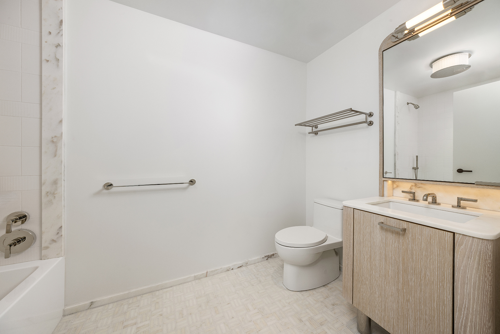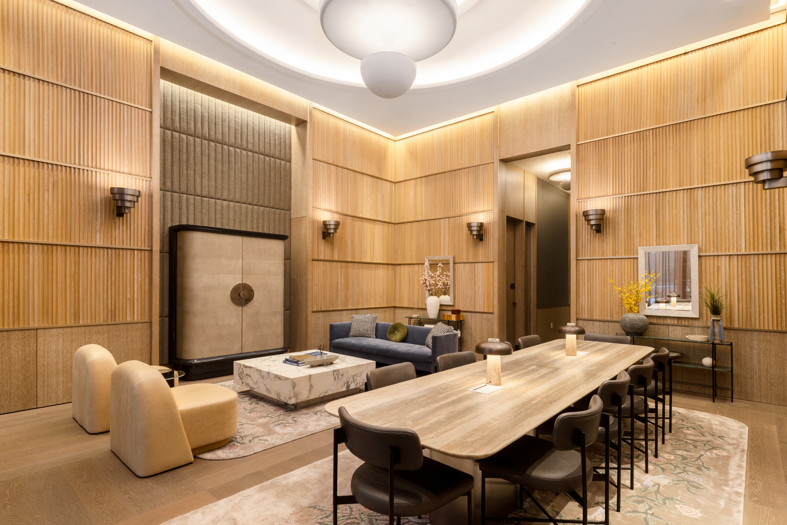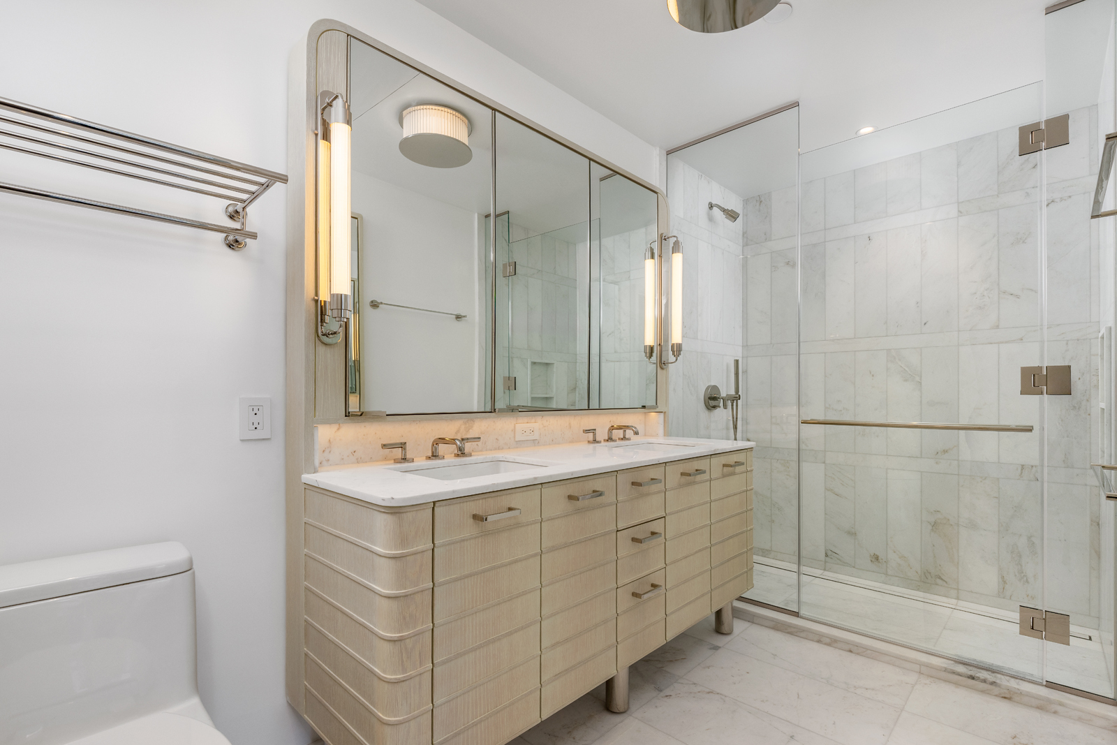 Secondary bathrooms are equally refined, offering custom cerused oak vanities, Bianco Oro marble, fluted porcelain tile walls, and mirrored medicine cabinets with integrated LED lighting.