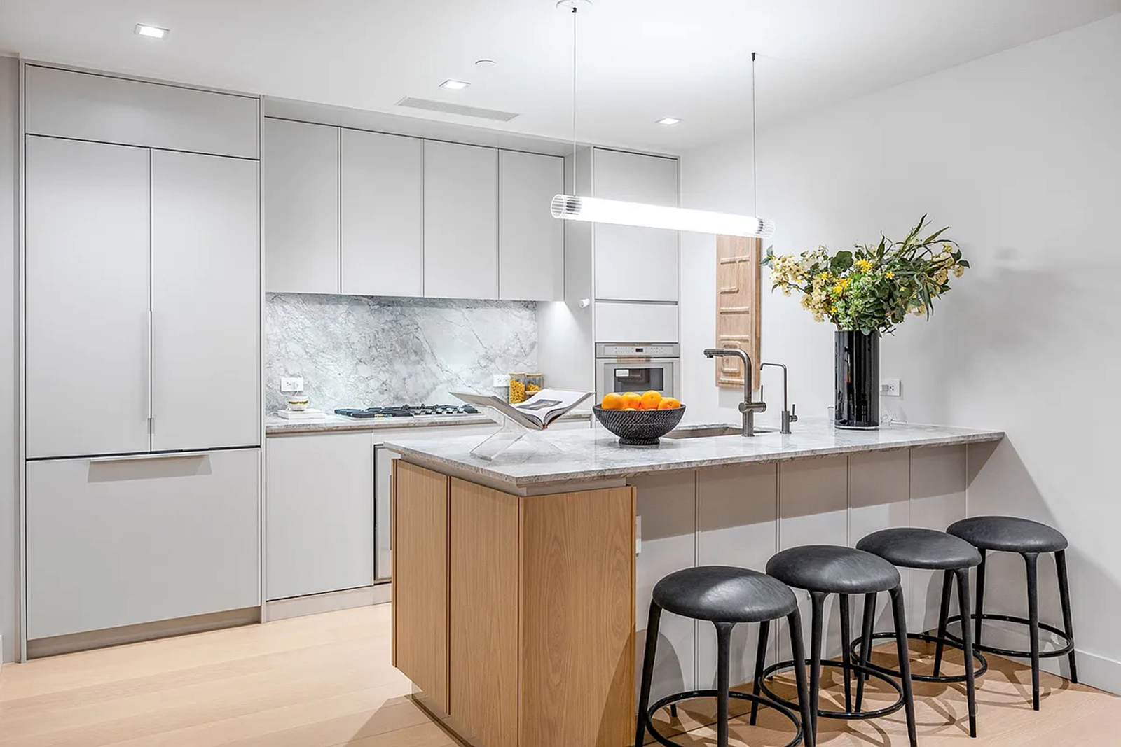 The open kitchen is a culinary masterpiece, featuring pristine marble countertops, a striking backsplash, and an island complemented by sleek white lacquer cabinets. Integrated high-end appliances, including a Thermador refrigerator and Bosch dishwasher, ensure a seamless cooking experience. Every residence is thoughtfully equipped with central air conditioning, an in-unit washer and dryer, and a smart entry lock for your convenience.