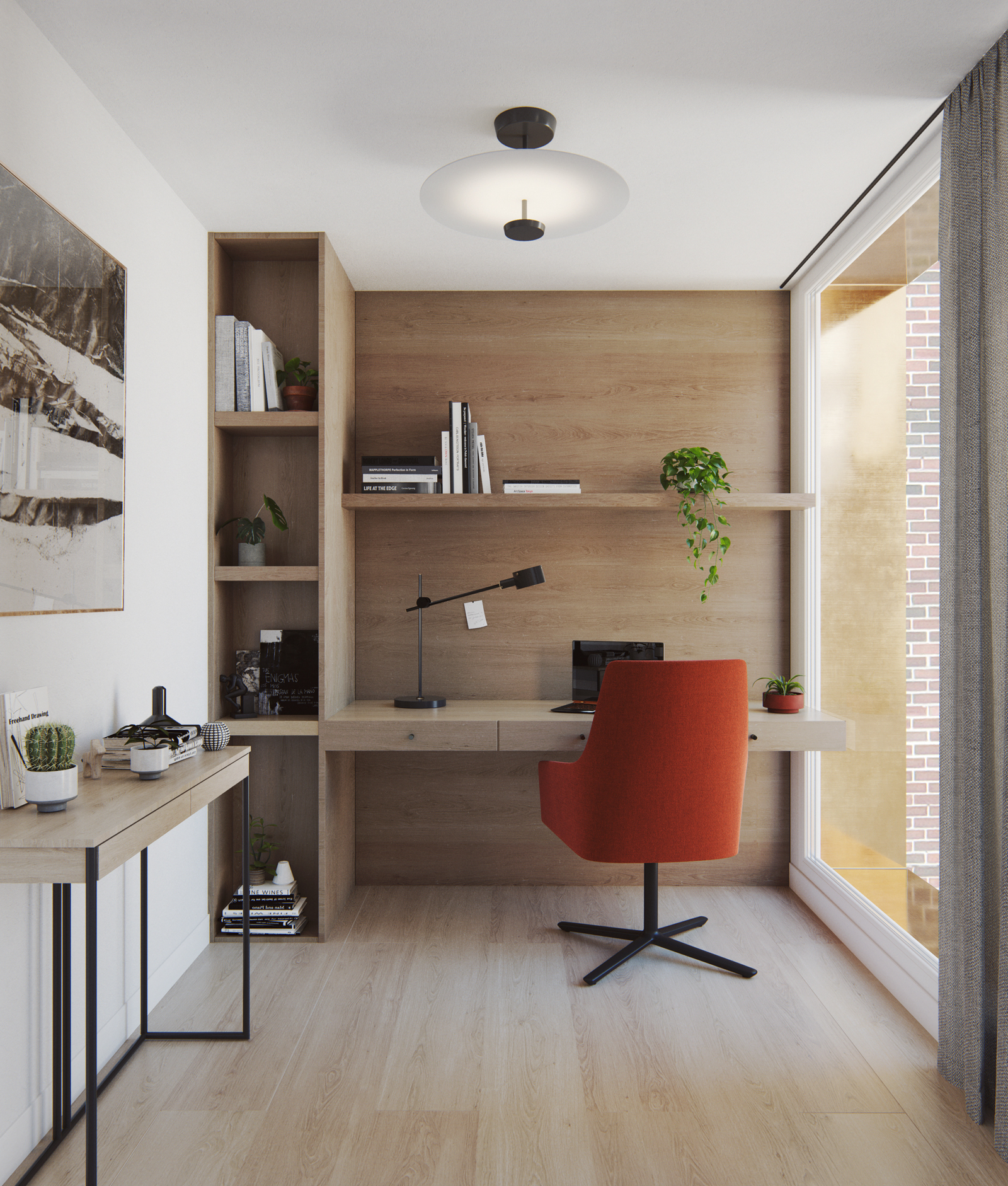 Each home boasts a custom-designed office, meticulously crafted with precision millwork, an efficient shelving system, and a desk with soft-close drawers. Seamless grommets for cord management enhance the organization and beauty of these artfully designed workspaces, elevating your professional environment.