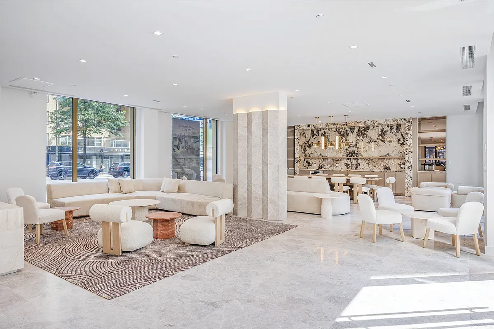The double-height lobby welcomes you into a world of elegance, leading to the resident lounge and a beautifully landscaped courtyard with outdoor seating. Here, residents can socialize, relax, or entertain in style, both indoors and outdoors. Descend the spiral staircase to find the state-of-the-art fitness center with cardio machines, free weights, and a private yoga studio. The wellness spa is adjacent to the fitness center, complete with a steam room and sauna, featuring slip-free teak flooring, a cool-off shower, and towel service. Additionally, residents can enjoy a landscaped rooftop terrace equipped with barbecues, lounge chairs, and dining areas.