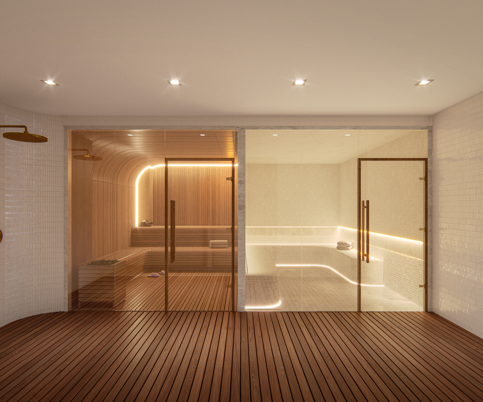 The double-height lobby welcomes you into a world of elegance, leading to the resident lounge and a beautifully landscaped courtyard with outdoor seating. Here, residents can socialize, relax, or entertain in style, both indoors and outdoors. Descend the spiral staircase to find the state-of-the-art fitness center with cardio machines, free weights, and a private yoga studio. The wellness spa is adjacent to the fitness center, complete with a steam room and sauna, featuring slip-free teak flooring, a cool-off shower, and towel service. Additionally, residents can enjoy a landscaped rooftop terrace equipped with barbecues, lounge chairs, and dining areas.