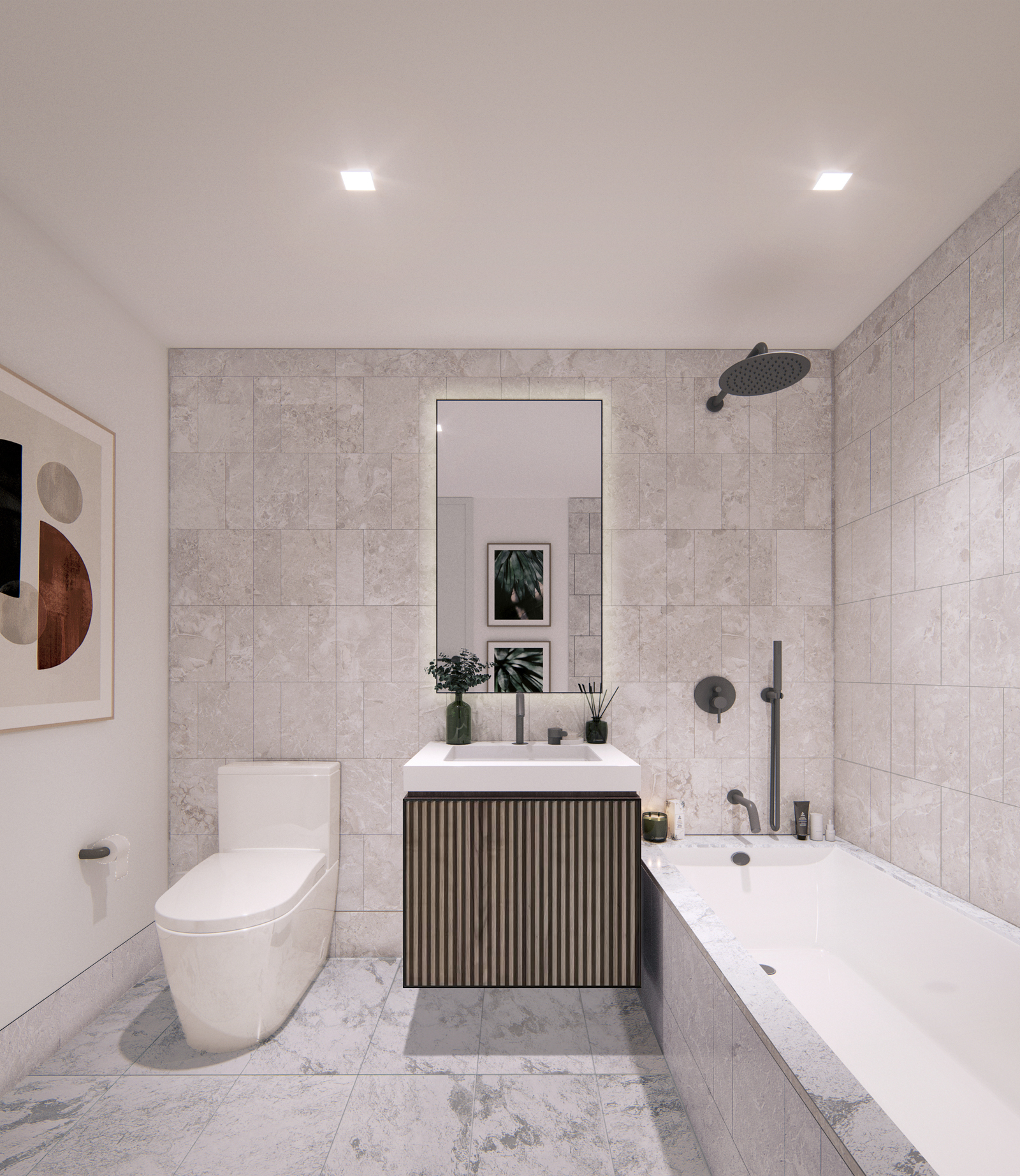 The primary bath is a haven of comfort and tranquility, featuring custom-built oak vanities, Bianco Sivec marble walls, and radiant-heated flooring. Additional apartment features include eight-inch plank oak flooring, abundant closet space, and optional extra storage.