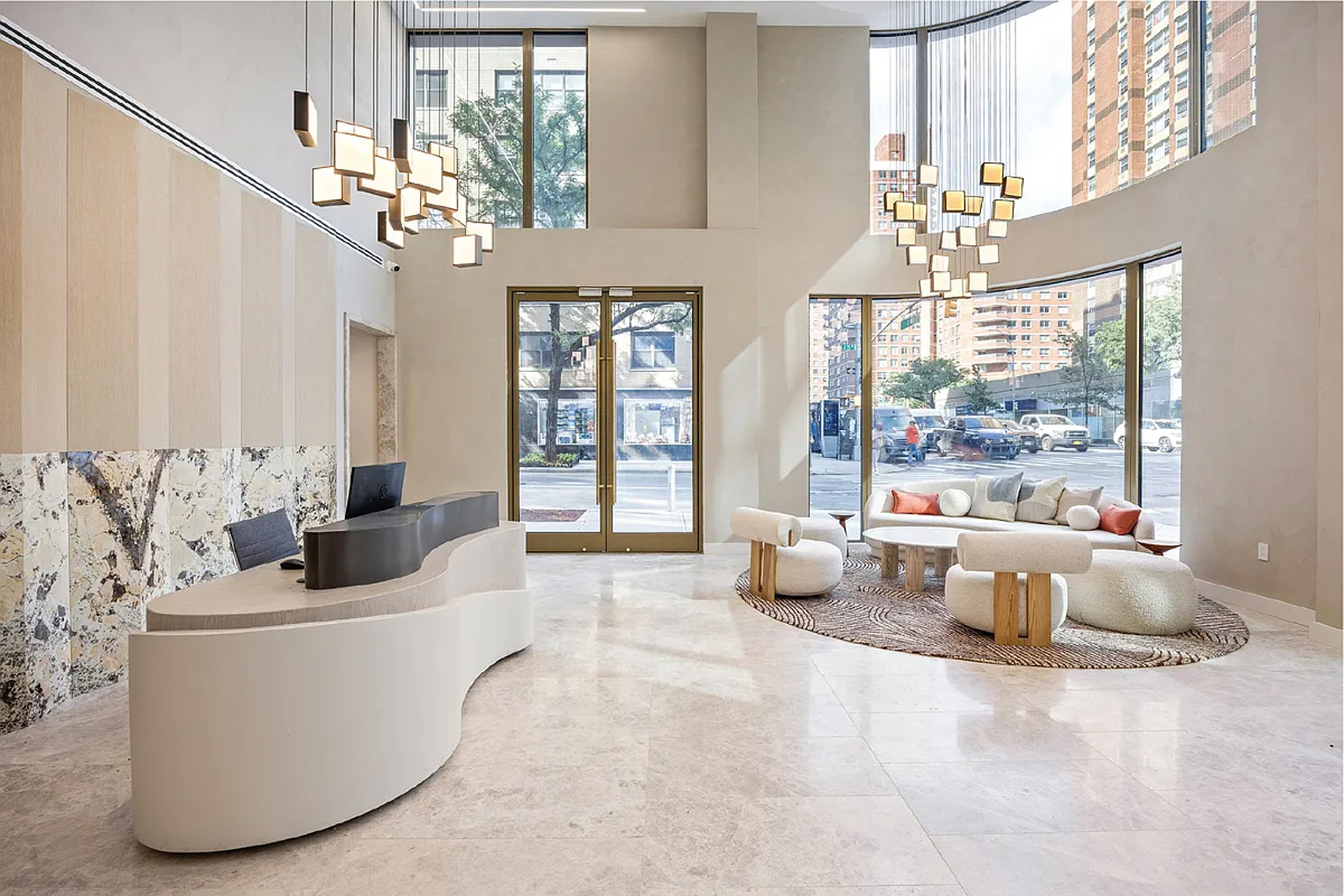 The double-height lobby welcomes you into a world of elegance, leading to the resident lounge and a beautifully landscaped courtyard with outdoor seating. Here, residents can socialize, relax, or entertain in style, both indoors and outdoors. Descend the spiral staircase to find the state-of-the-art fitness center with cardio machines, free weights, and a private yoga studio. The wellness spa is adjacent to the fitness center, complete with a steam room and sauna, featuring slip-free teak flooring, a cool-off shower, and towel service. Additionally, residents can enjoy a landscaped rooftop terrace equipped with barbecues, lounge chairs, and dining areas.