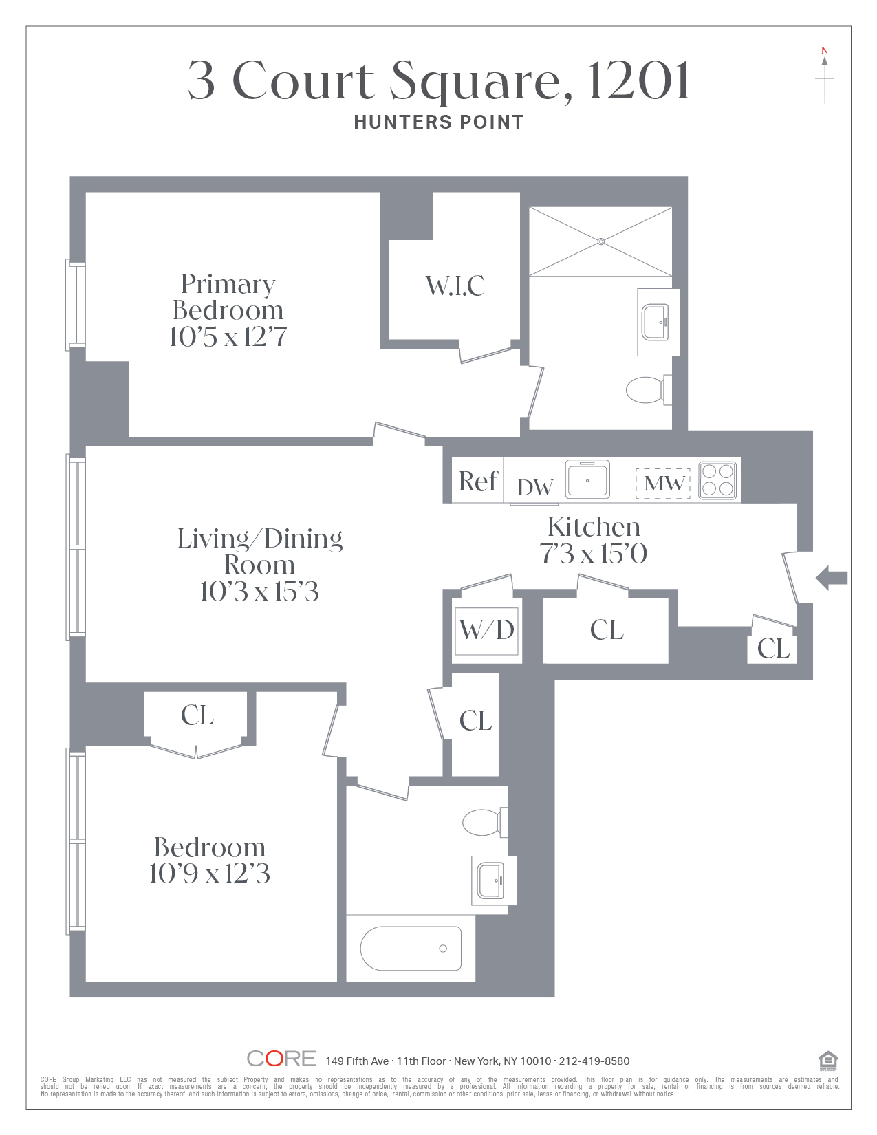 The two bedrooms feature a split layout, and each showcases gorgeous views of the Manhattan skyline. The primary bedroom offers an oversized walk-in closet and a spa-inspired en-suite bathroom with a glass-enclosed shower.