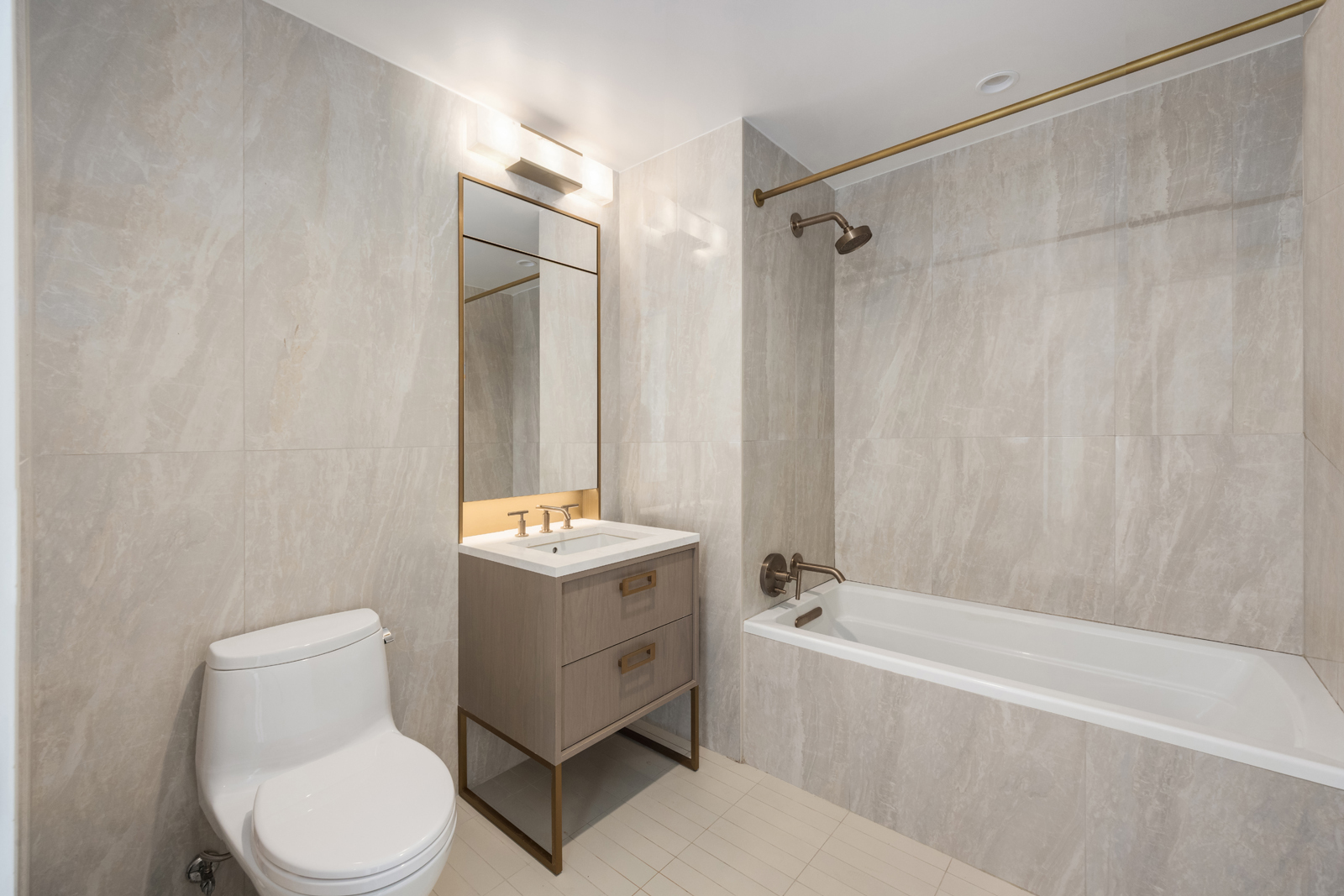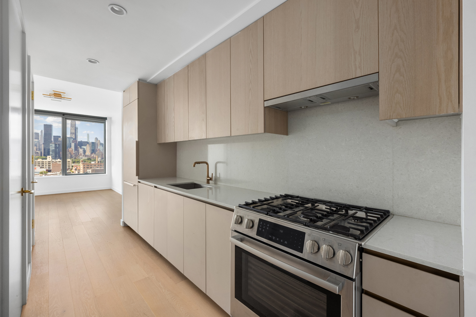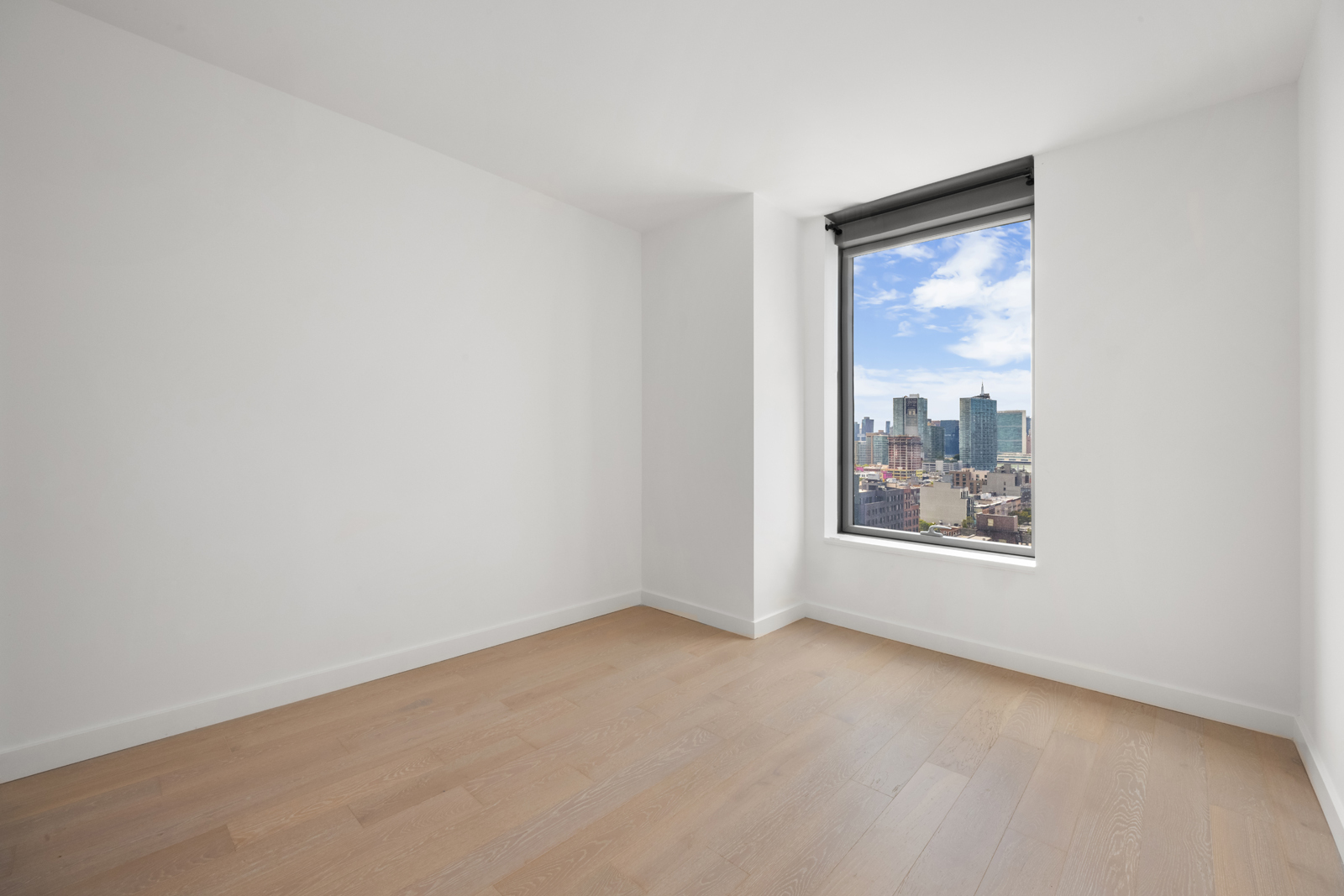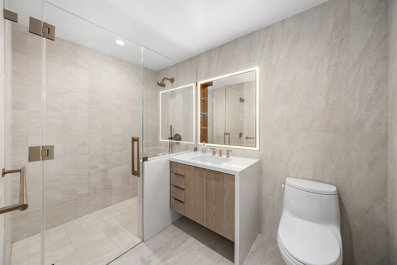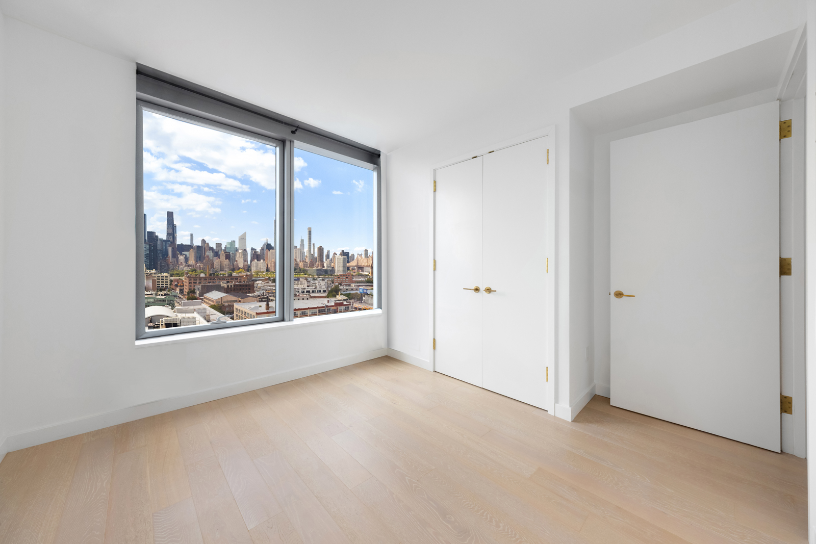 The two bedrooms feature a split layout, and each showcases gorgeous views of the Manhattan skyline. The primary bedroom offers an oversized walk-in closet and a spa-inspired en-suite bathroom with a glass-enclosed shower.