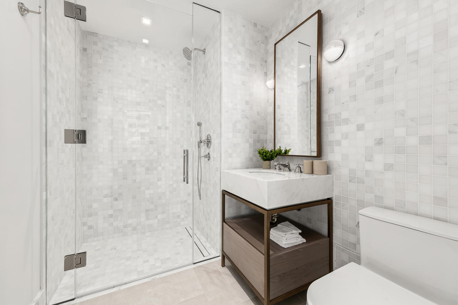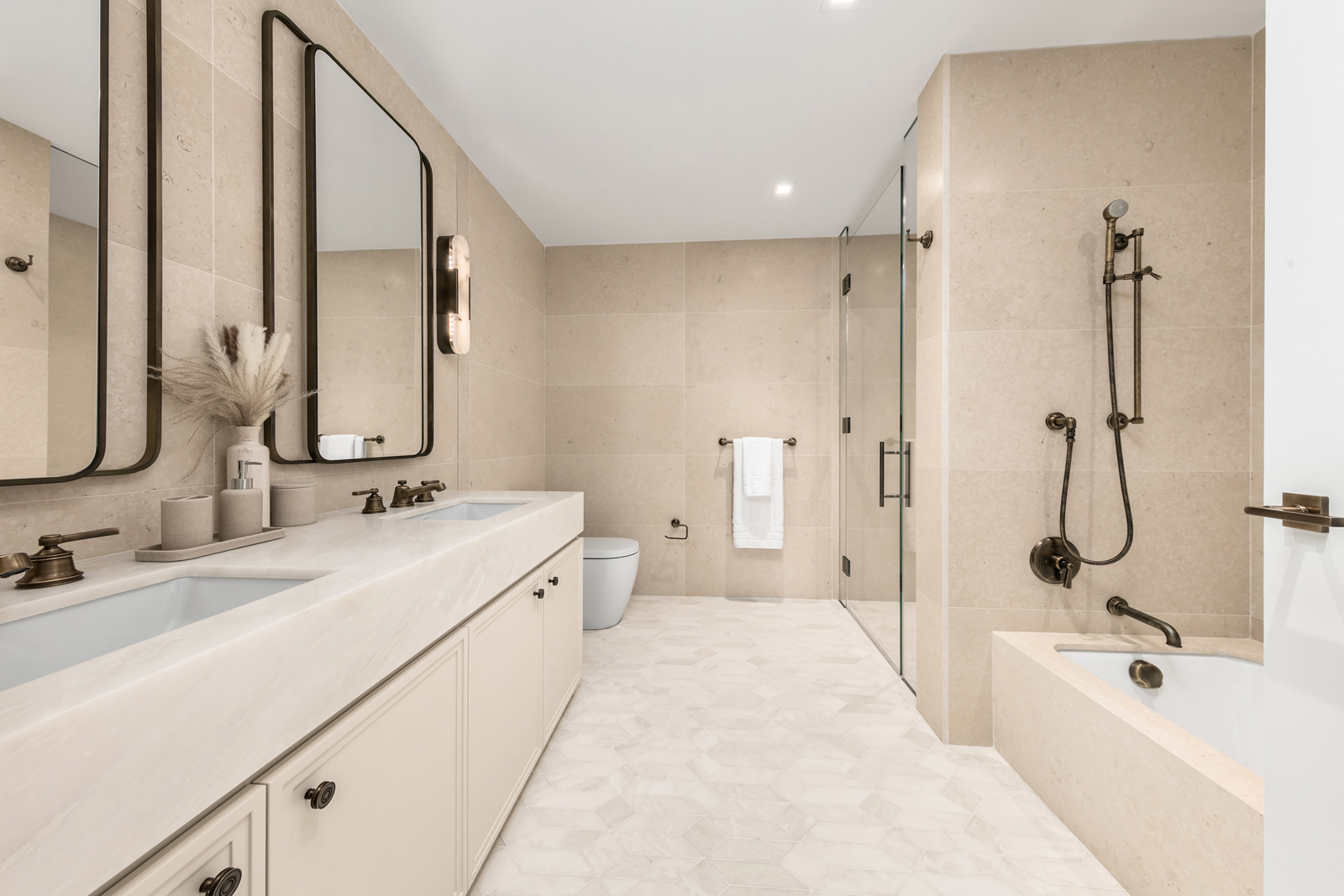 The primary bathroom is a sanctuary of refinement, enveloped in Crema Luna limestone complemented by Namibia white marble. Radiant heated floors and high-end plumbing fittings from WaterWorks elevate the luxurious experience. Additional features of this apartment include a separate powder room, white oak flooring, solid core wood doors with Valli & Valli hardware, a side-by-side washer and dryer, and a high-efficiency central VRF system for heating and cooling.