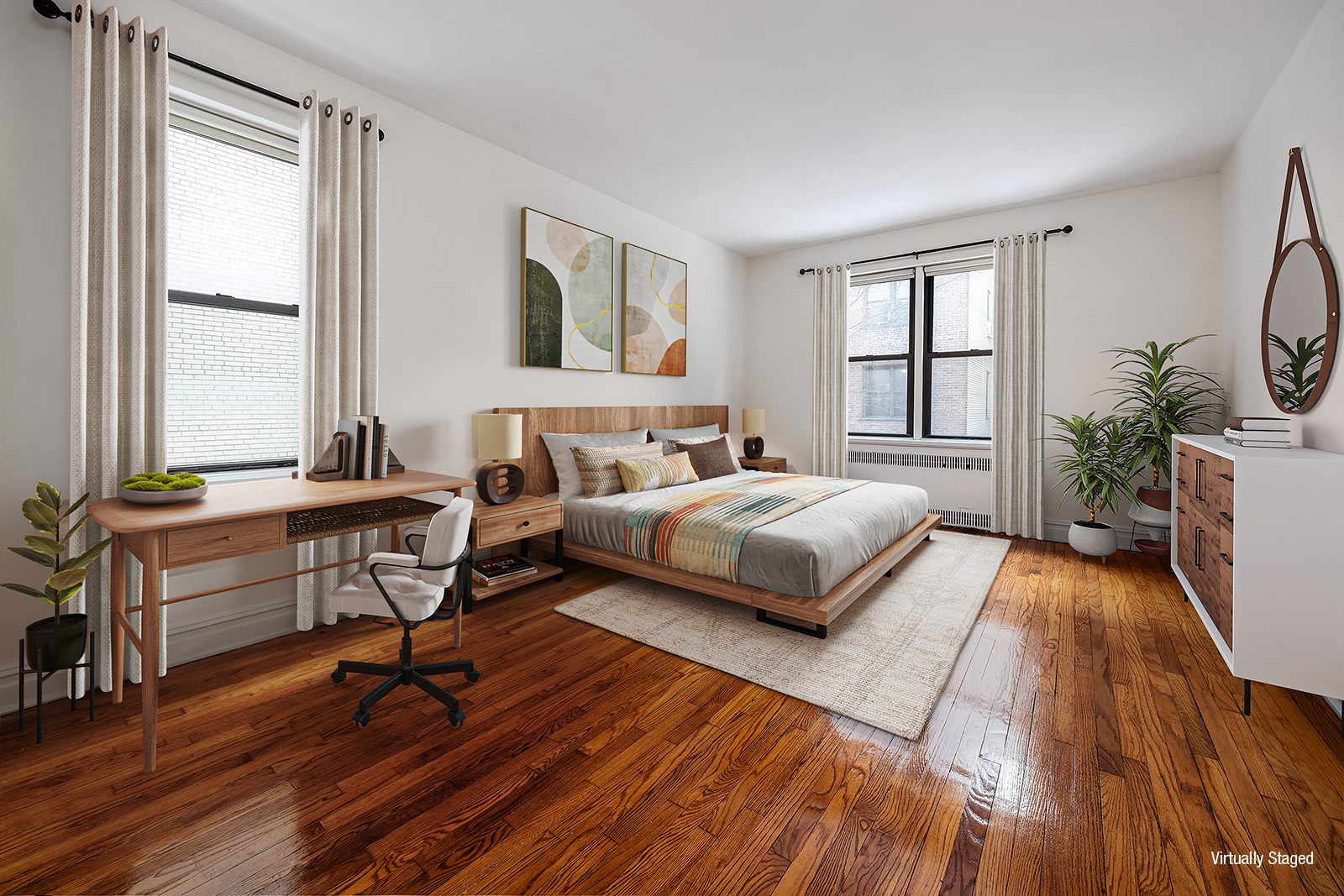 Anchored by immaculate original hardwood floors, this highly functional layout offers a dedicated dining area, a fully equipped kitchen with custom mahogany cabinets, a spacious corner bedroom, a tastefully renovated subway tile bath, and ample closets.