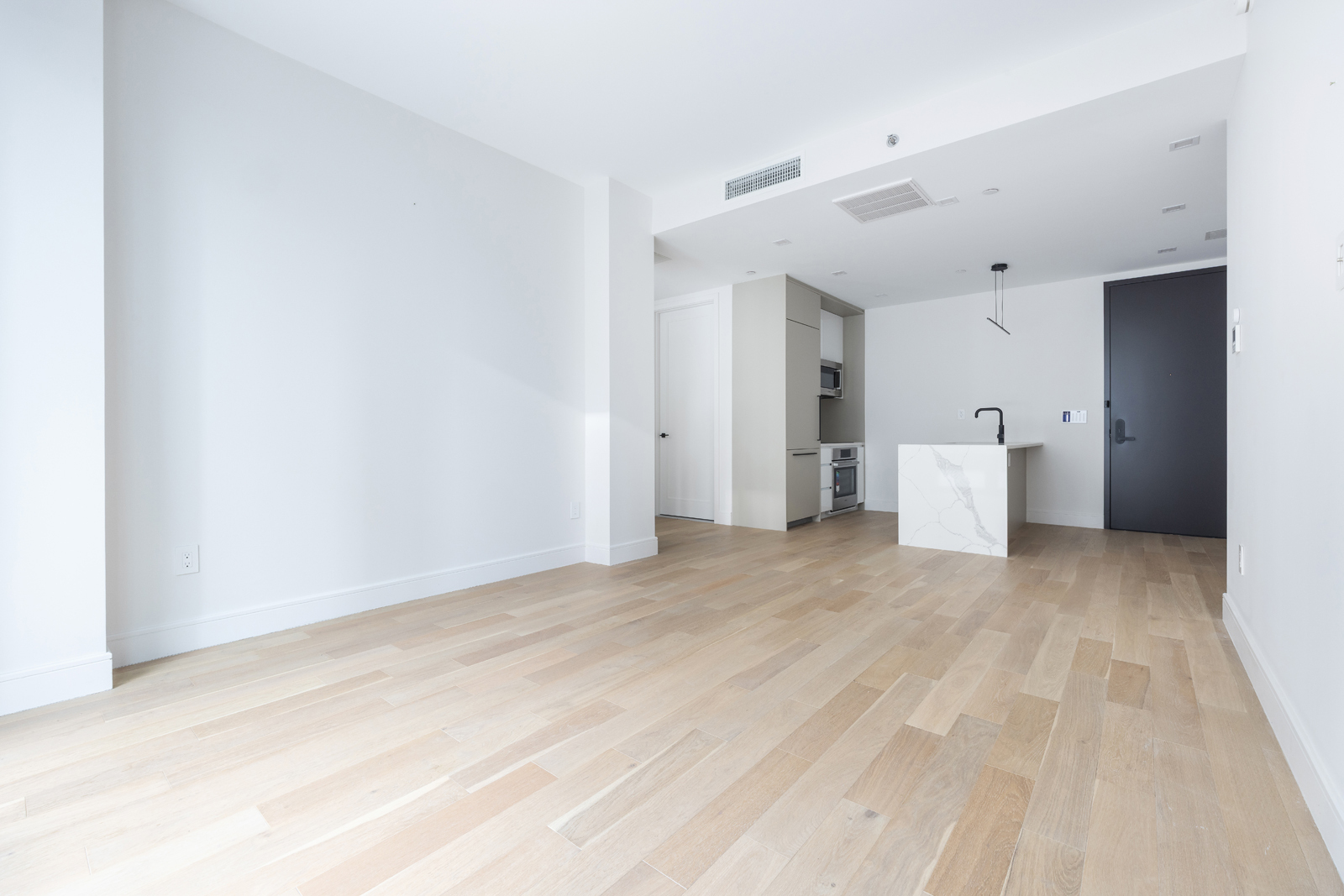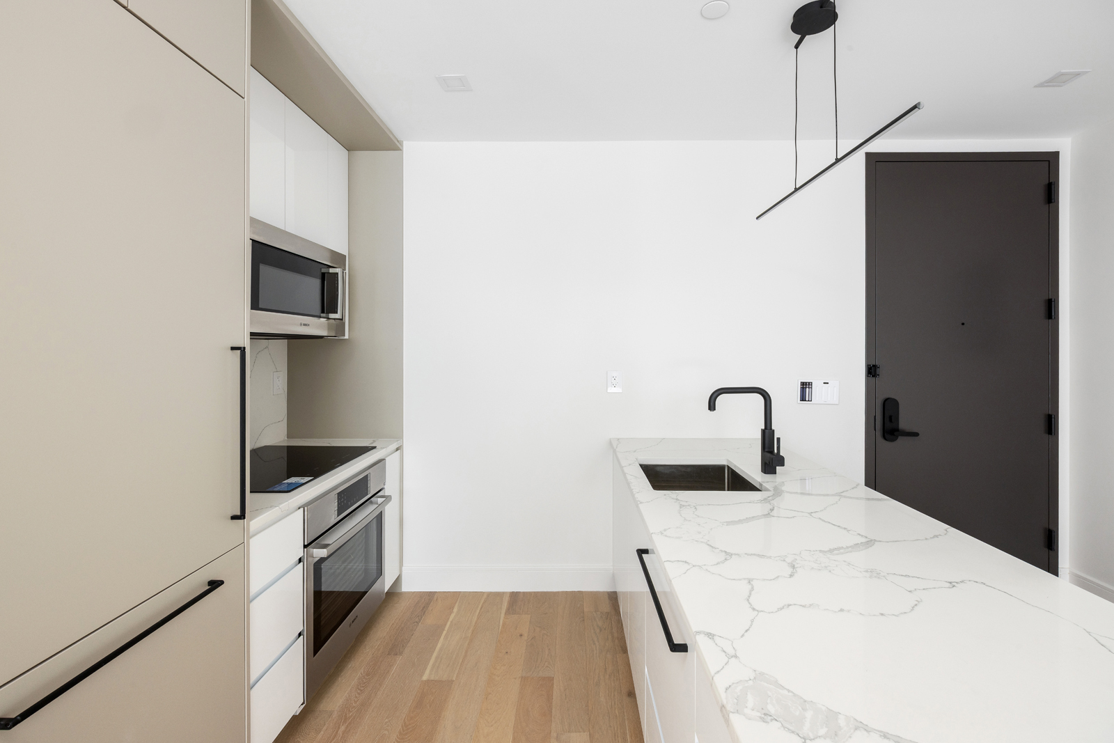 Inside, triple-pane floor-to-ceiling windows provide exceptional sound insulation and abundant natural light, while soaring ceilings enhance the open, airy ambiance. The sleek, chef-inspired kitchen is outfitted with full exterior ventilation, matte-black Signature fixtures, elegant quartz countertops, and premium Bosch 800 Series appliances.