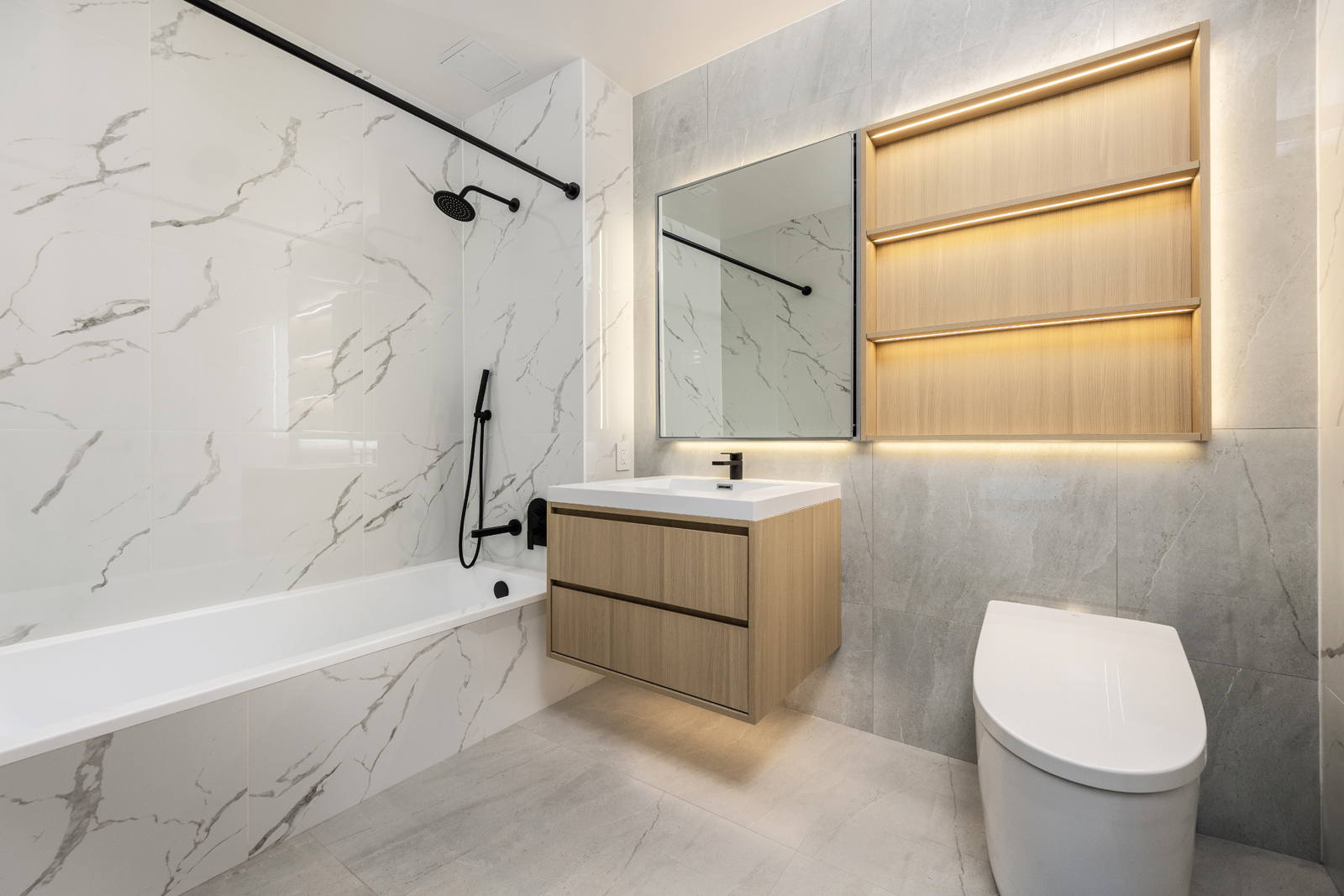 The primary bedroom offers generous closet space and direct access to a spa-like bathroom featuring porcelain tile finishes, Signature fixtures, heated floors, and a high-end Toto Neorest automatic toilet. An in-unit LG washer and dryer add everyday convenience.