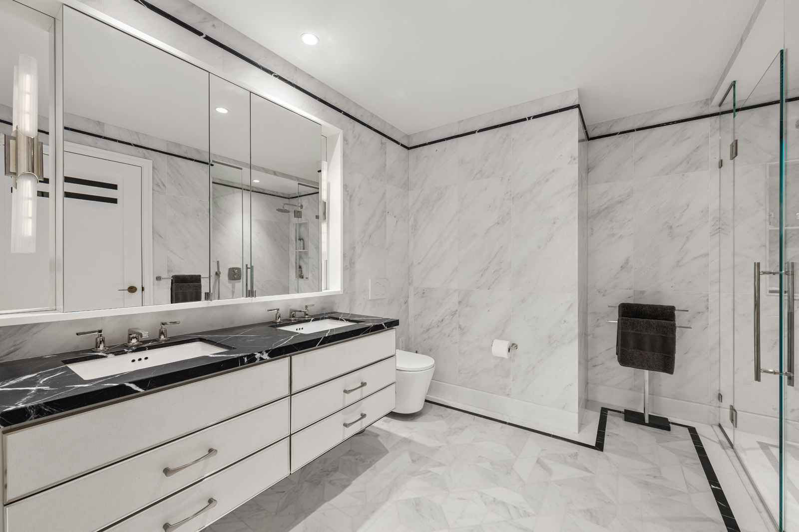 - Serene primary bathroom appointed with honed Pacific White Marble and Calacatta Black marble accents, featuring a deep soaking tub, radiant heated floors, and a custom vanity to create a spa-like retreat.