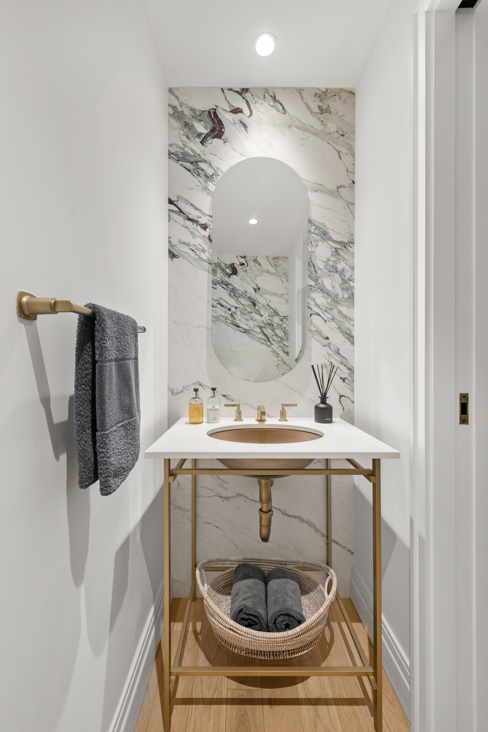 - Elegant powder room with Breccia Capraia marble slab accent walls, providing a luxurious experience for guests.