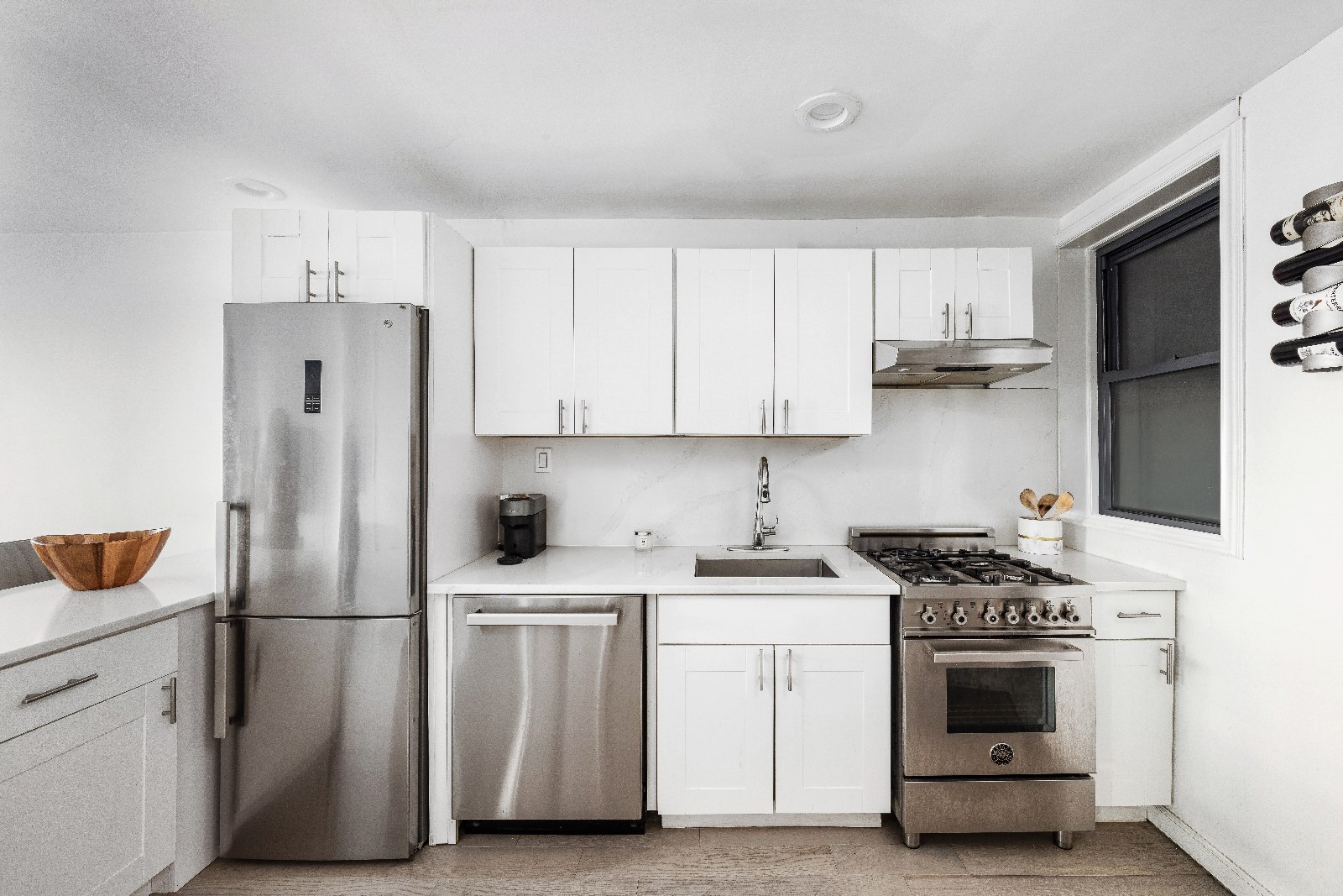 - Newly renovated kitchen features refined Caesarstone finishes, generous cabinetry, and sleek Bertazzoni appliances