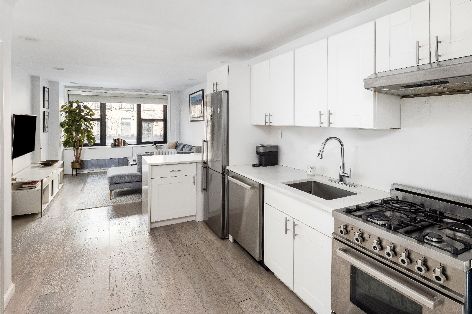 - Welcoming living and dining area highlighted by a large picture window overlooking a charming, tree-lined street