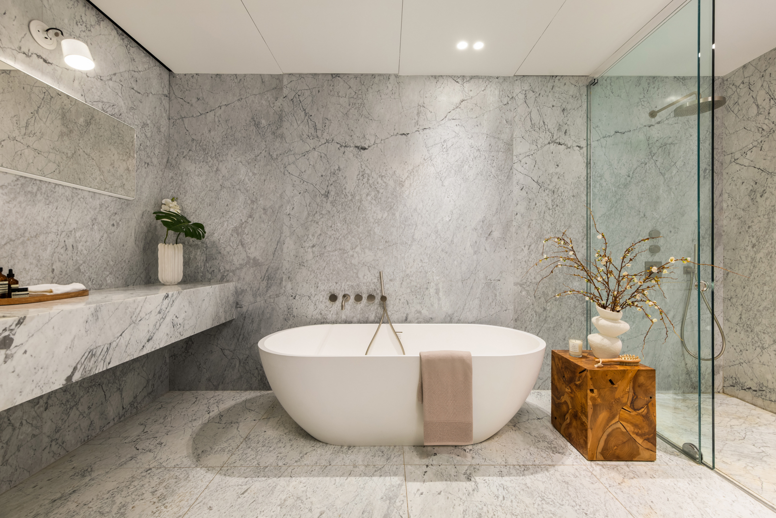 Privately positioned, the primary suite is oriented to the southeast, capturing soft, consistent light. Custom Rimadesio closets line the space, while the en-suite bath is finished in floor-to-ceiling marble, complete with a freestanding soaking tub and an oversized rain shower.