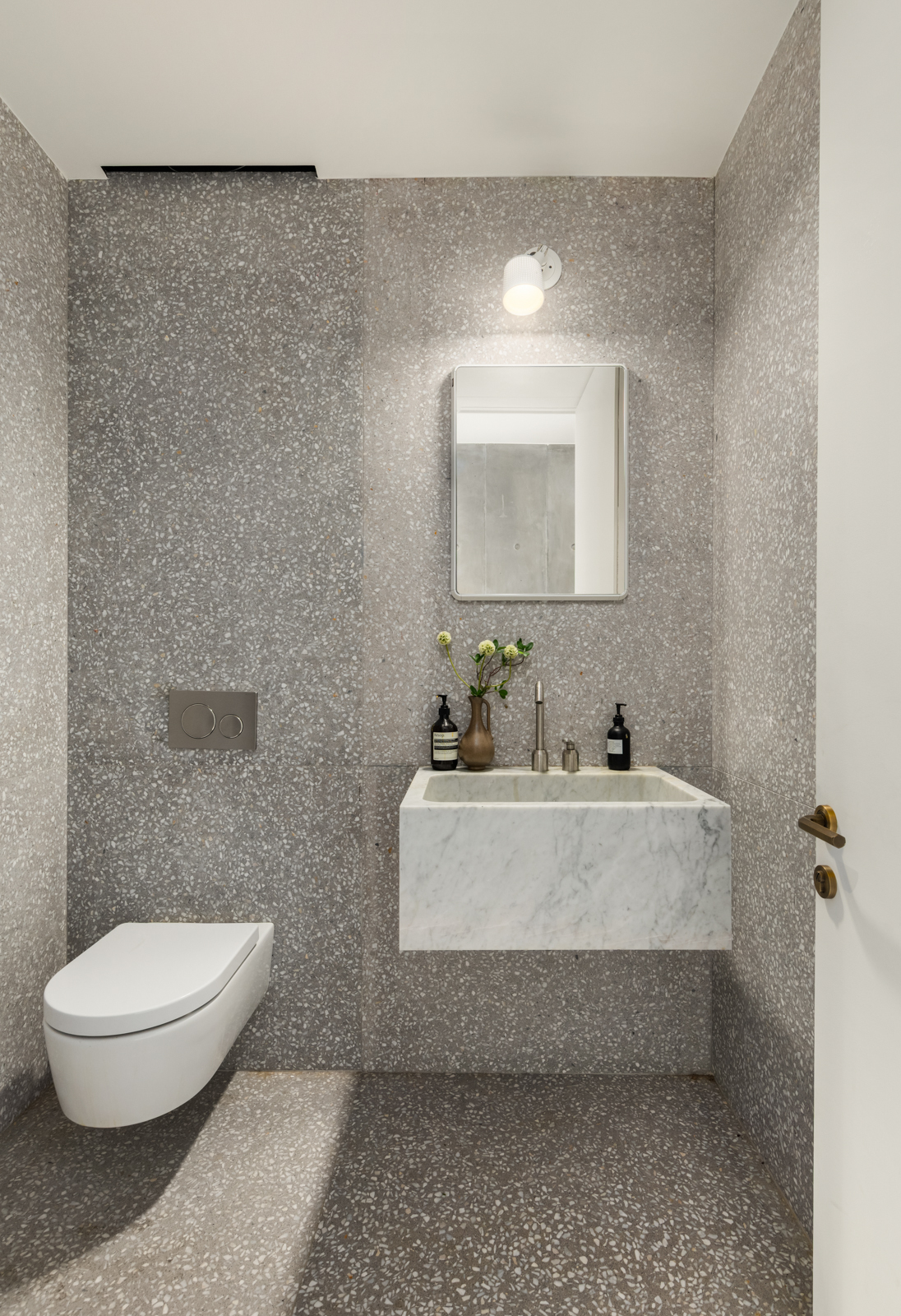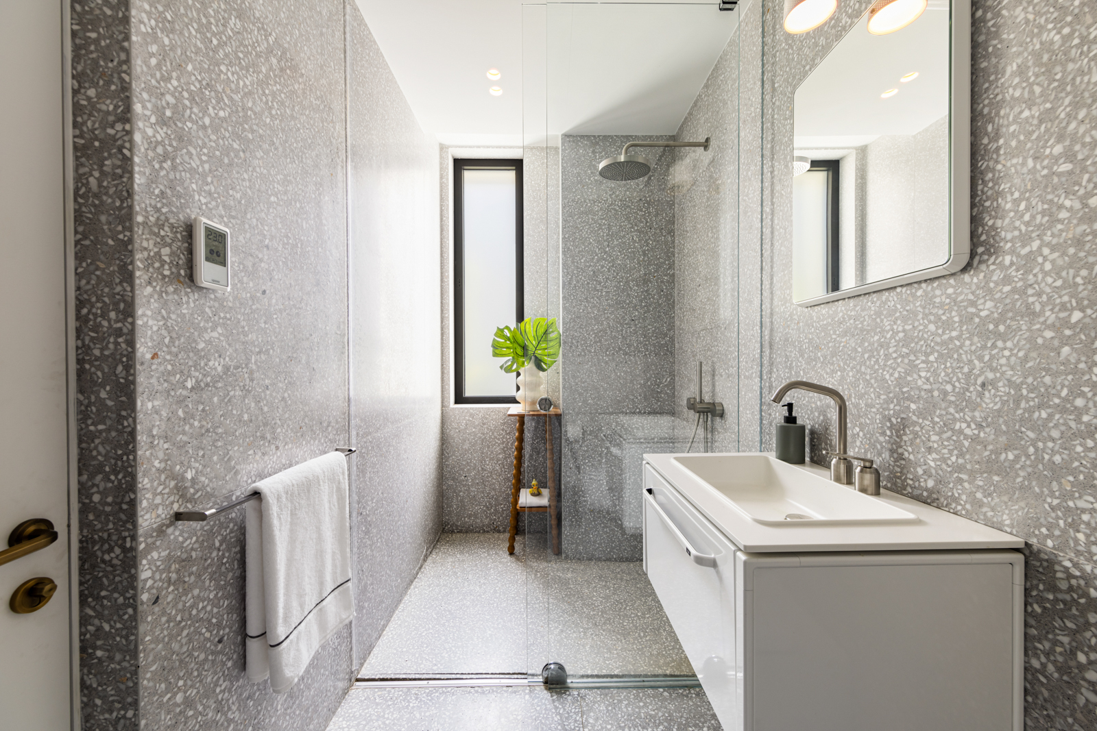 Two additional bedrooms, each with en-suite baths, continue the same material language—terrazzo surfaces, clean-lined vanities, and a restrained palette that feels both modern and enduring.