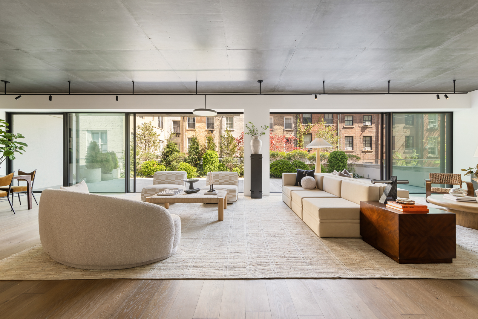The transition between indoors and out is seamless. Floor-to-ceiling sliding glass doors allow the living space to extend naturally onto the terrace, creating a setting that adapts effortlessly—equally suited for everyday living as it is for larger gatherings.