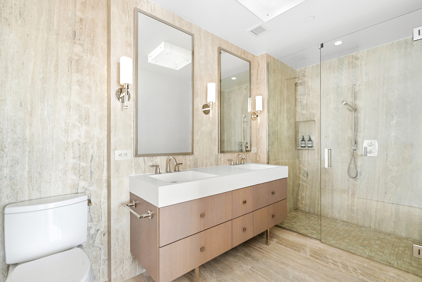 The primary bath is finished in Calacatta Borghini marble, warm travertine, and polished nickel fixtures—timeless, understated, and luxurious.