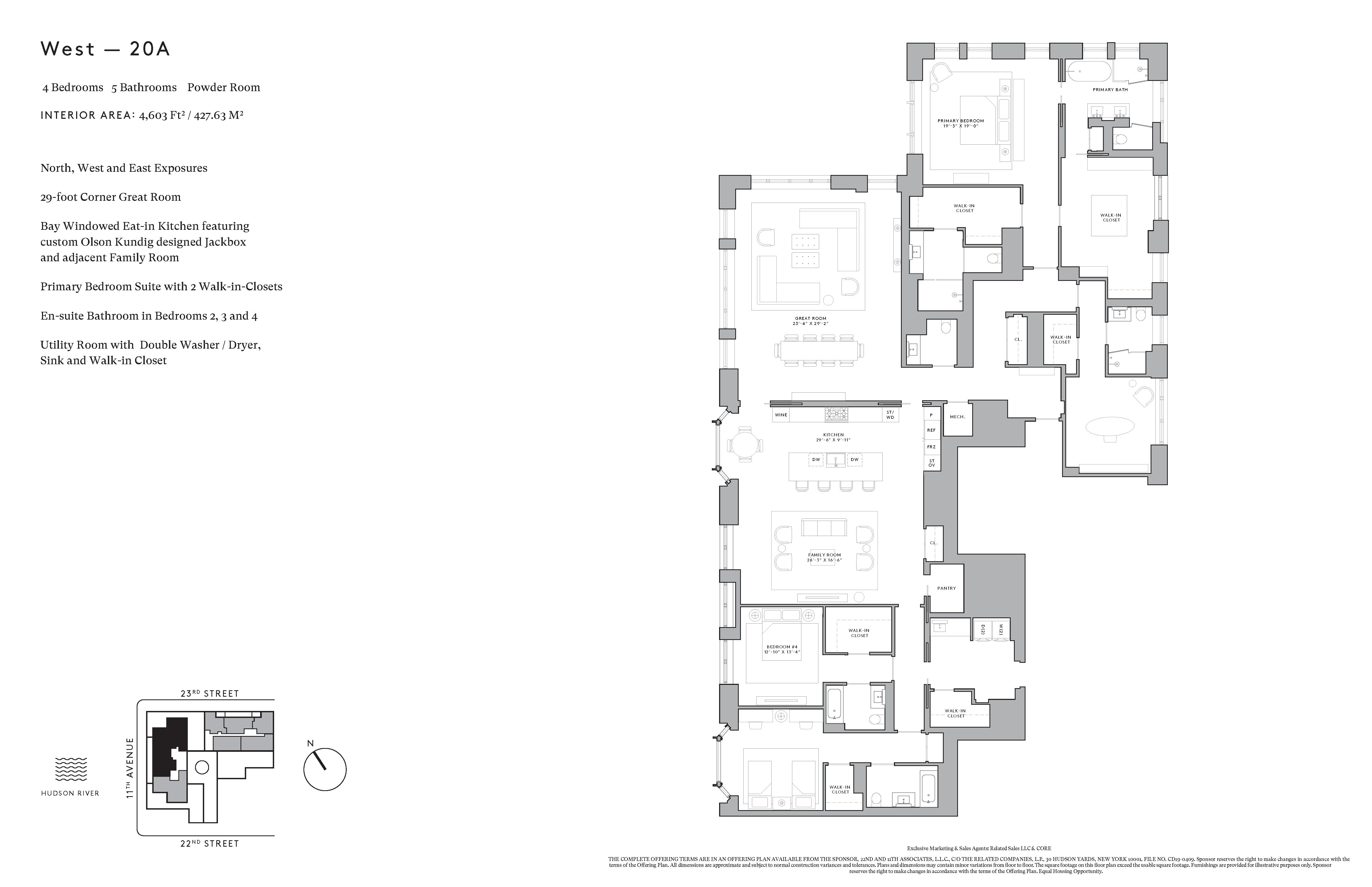 Residence 20A is 4,603 SF with four bedrooms and five-and-a-half bathrooms. The expansive, open-plan living and dining areas feature unobstructed views of the Hudson River, a 29-foot corner great room, a windowed eat-in kitchen with a custom Olson Kundig-designed Jackbox, warm wood flooring, and floor-to-ceiling windows. The primary bedroom suite features two walk-in closets connected to two full bathrooms. Each of the additional bedrooms is complete with an en-suite bathroom. A utility room with a double washer/dryer, sink, and walk-in closet ties into a secondary entry point.