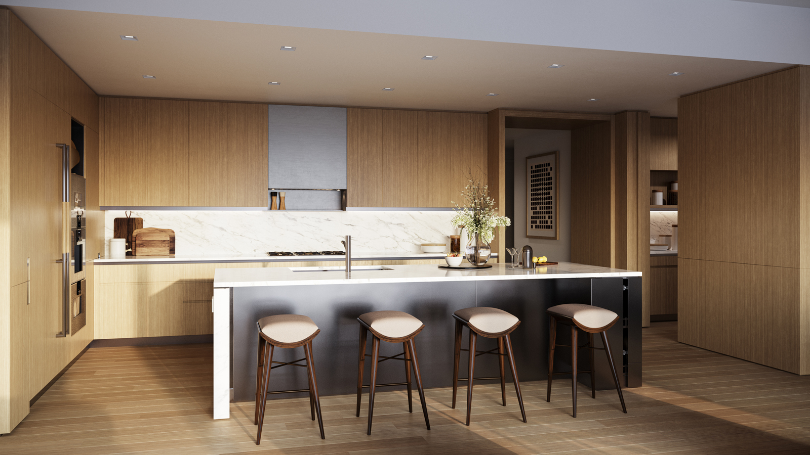 Residence 3EE is 1,623 SF with three bedrooms and three bathrooms. The expansive, open-plan living and dining areas feature a south-facing 1,517 SF private terrace, 21-foot corner great room, kitchen with a custom Olson Kundig designed Jackbox, warm wood flooring, and floor-to-ceiling windows.