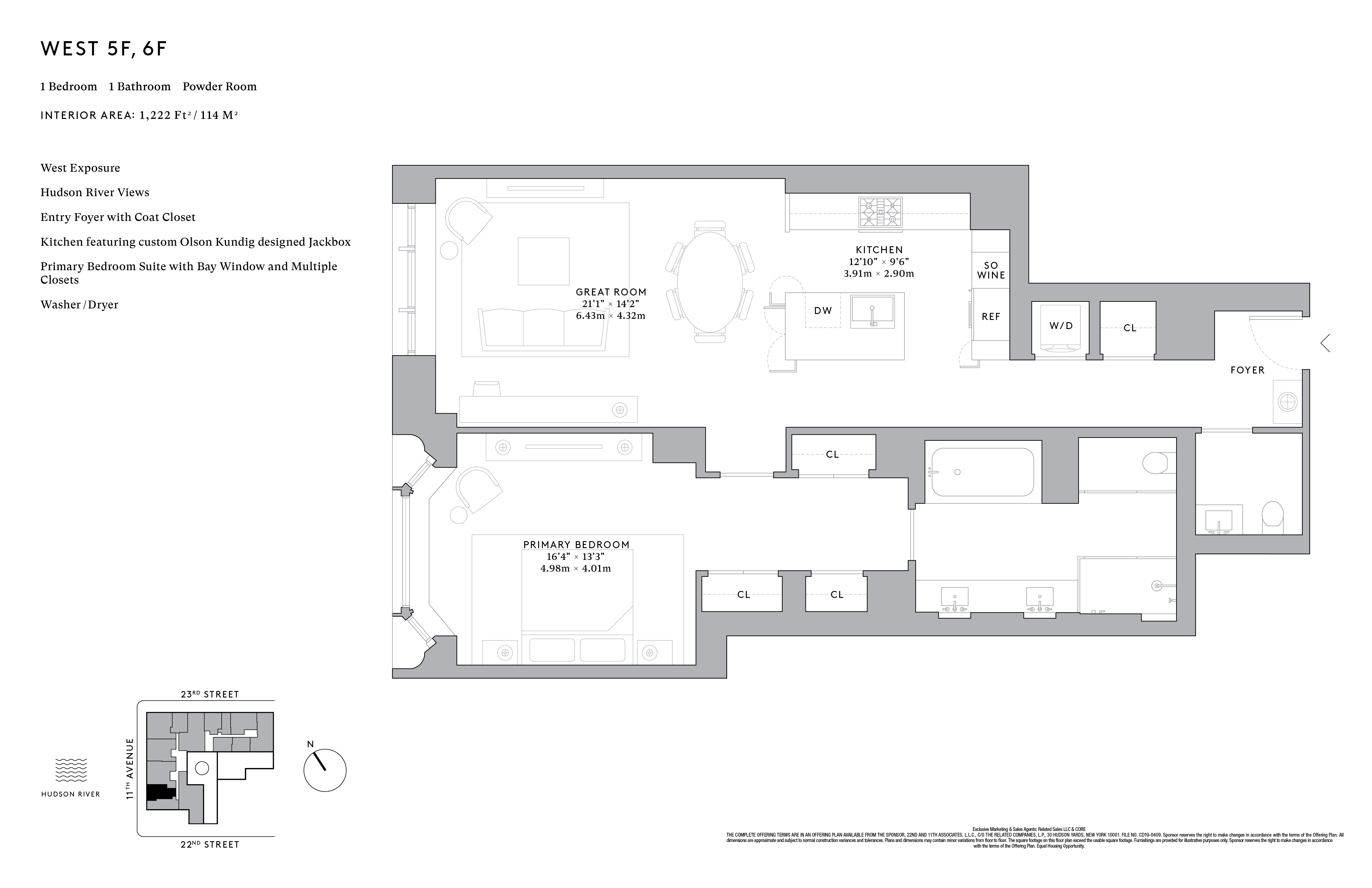 Residence 6FW is 1,222 SF with one bedroom and one-and-a-half bathrooms. The expansive, open-plan living and dining areas feature a west exposure, a kitchen with a custom Olson Kundig-designed Jackbox, warm wood flooring, and floor-to-ceiling windows