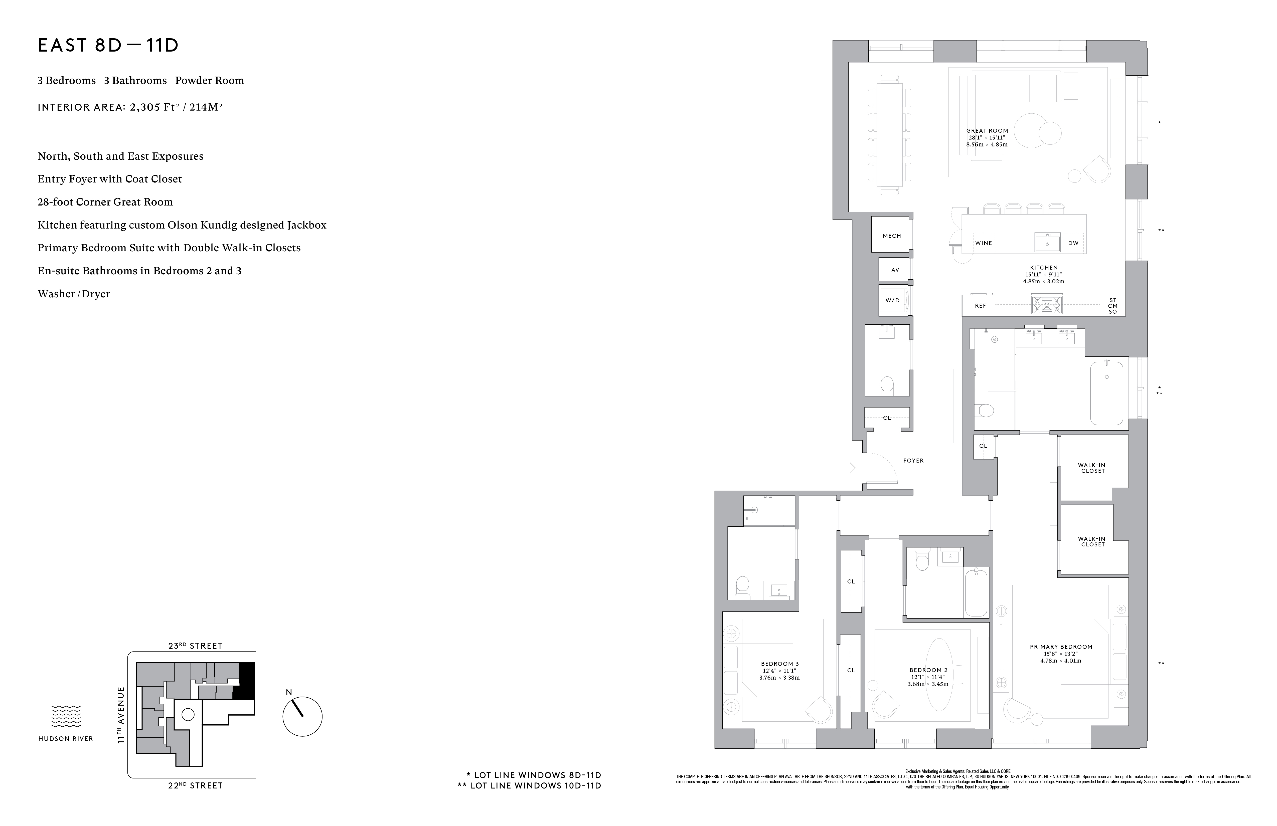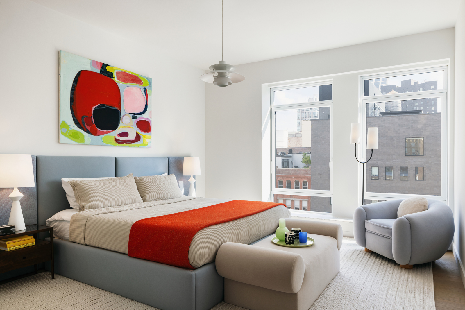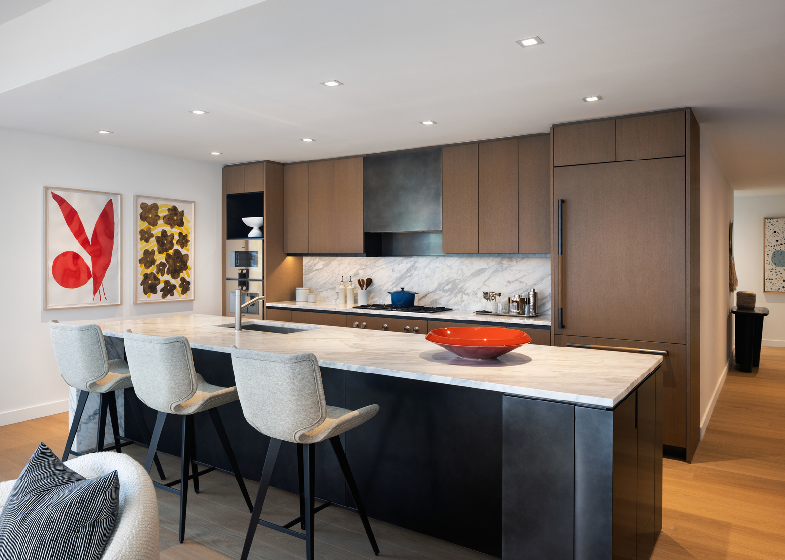 Residence 9DE is 2,305 SF with three bedrooms and three-and-a-half bathrooms. The expansive, open-plan living and dining areas feature north and south exposures, a 28-foot corner great room, a kitchen with a custom Olson Kundig-designed Jackbox, warm wood flooring, floor-to-ceiling windows, and a master suite with double walk-in closets.