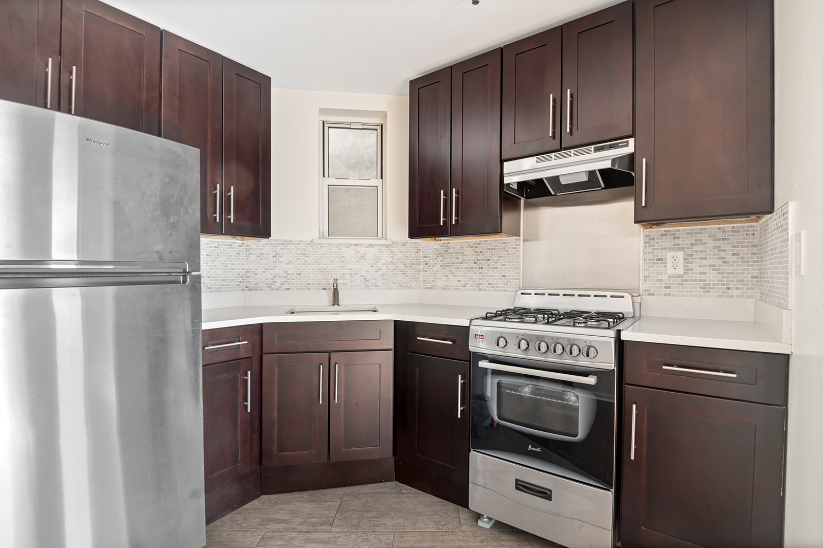 You enter this bright and sunny home into the spacious living/dining room with a southeastern exposure. Immediately to your left is the renovated, open kitchen with a window, stainless steel appliances, dark wood cabinets, under-cabinet lighting and quartz countertops.