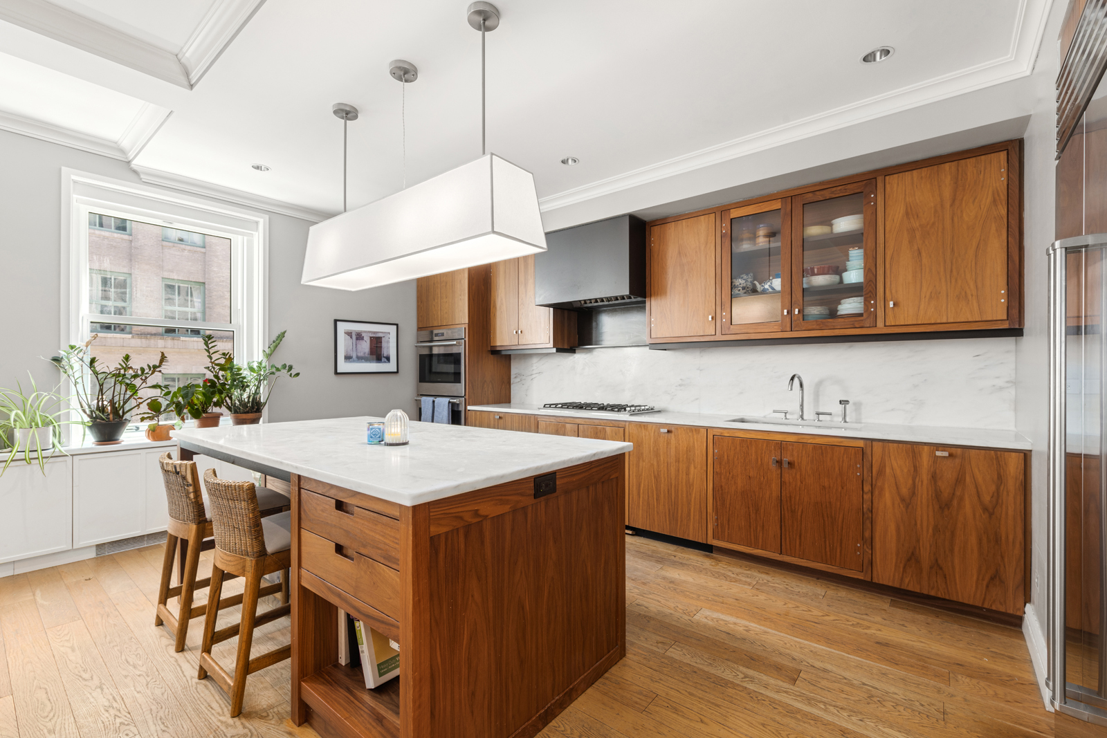 -Chef's kitchen: Elegant island, marble countertops, top-of-the-line appliances (Sub-Zero fridge, Miele dishwasher, Viking 6-burner cooktop)