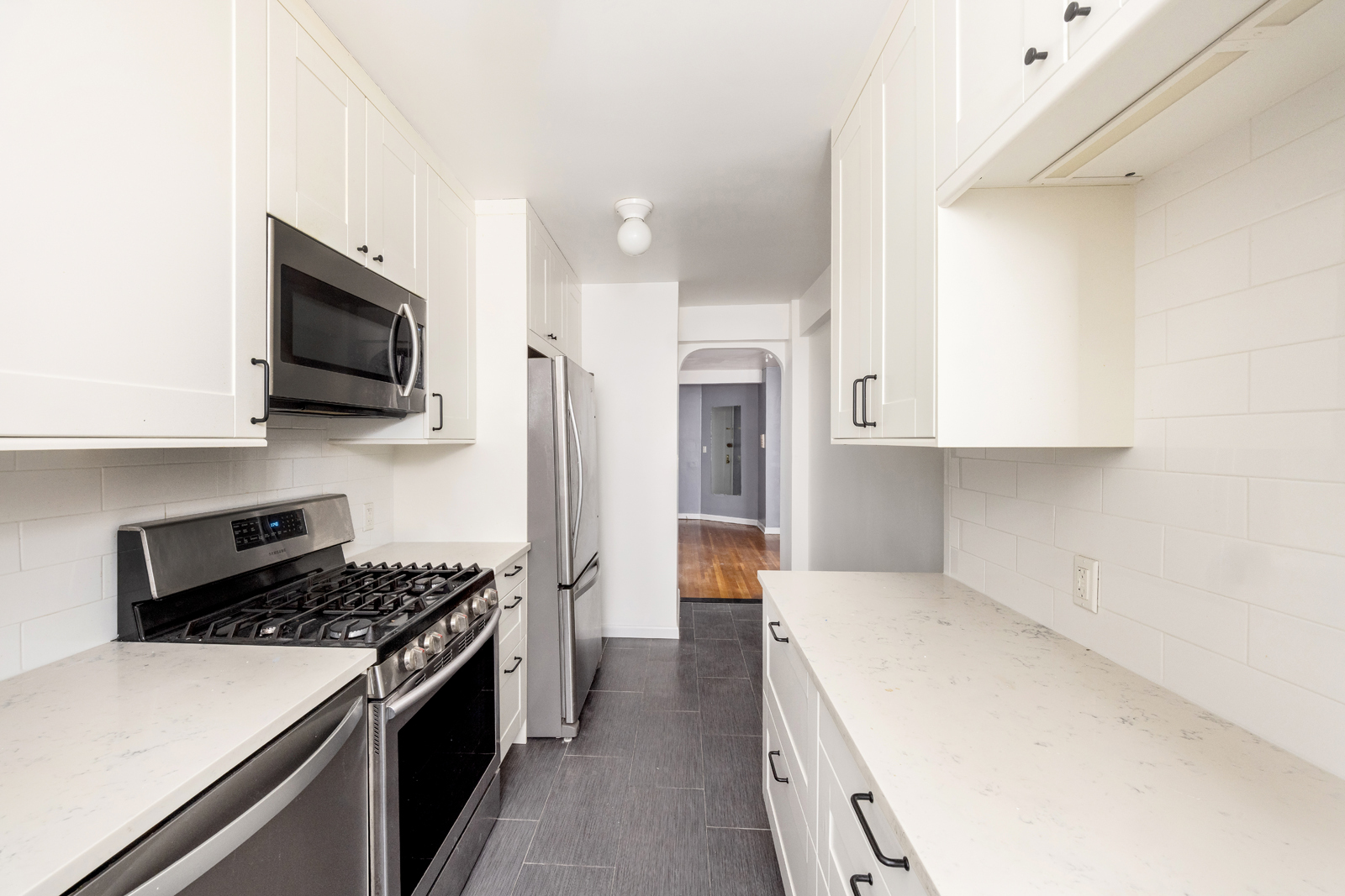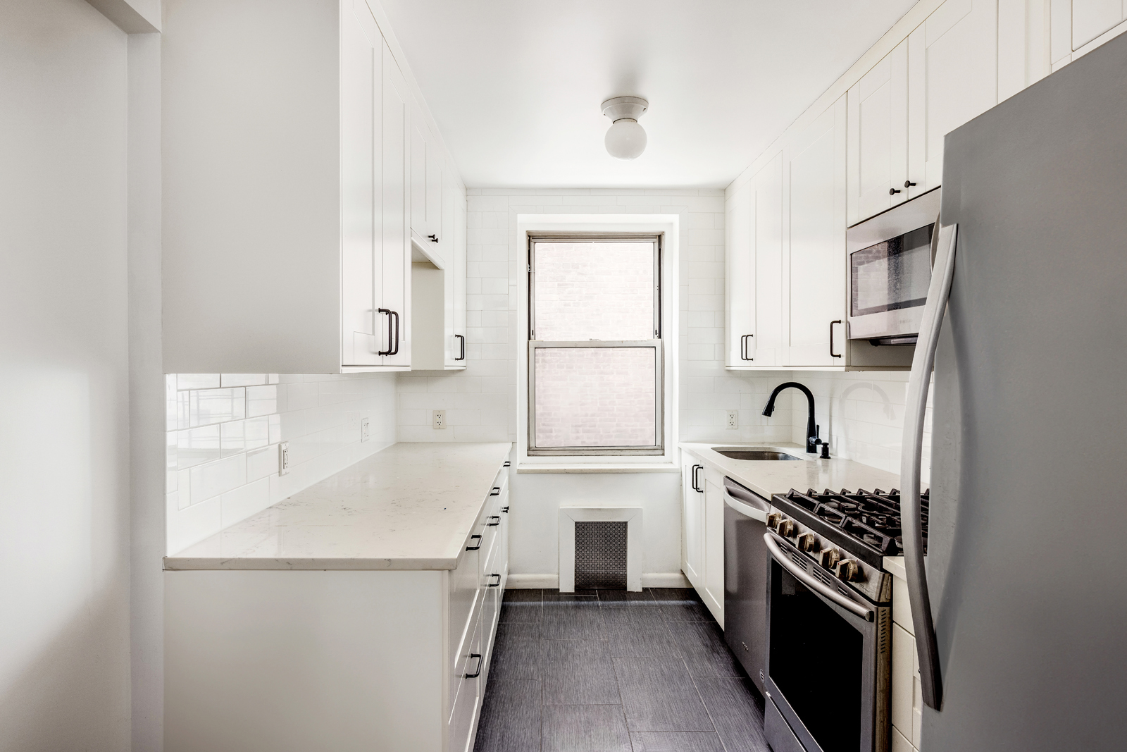 The fully renovated windowed eat-in kitchen features custom shaker cabinets, stone counters, a full line of stainless-steel appliances, complete with a dishwasher, ample storage, under-cabinet lighting, and quality finishes. The bathroom is tiled in classic ceramic tile and finished with quality fixtures.